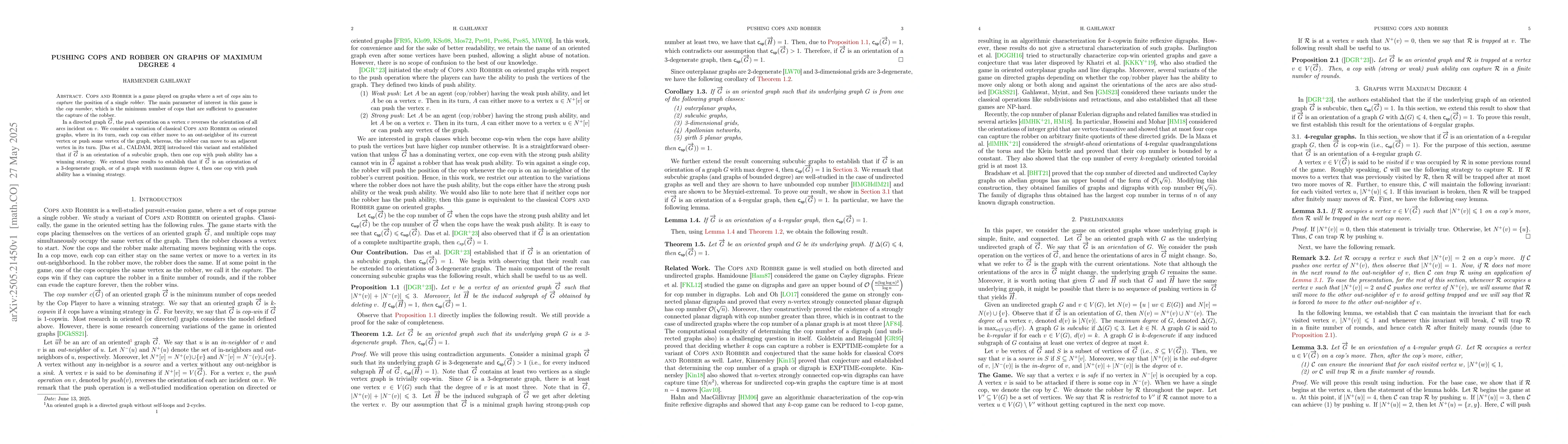 The paper establishes winning strategies for cops with push abilities in orientations of subcubic, 3-degenerate graphs, and graphs with maximum degree 4 in the Pushing Cops and Robber game.