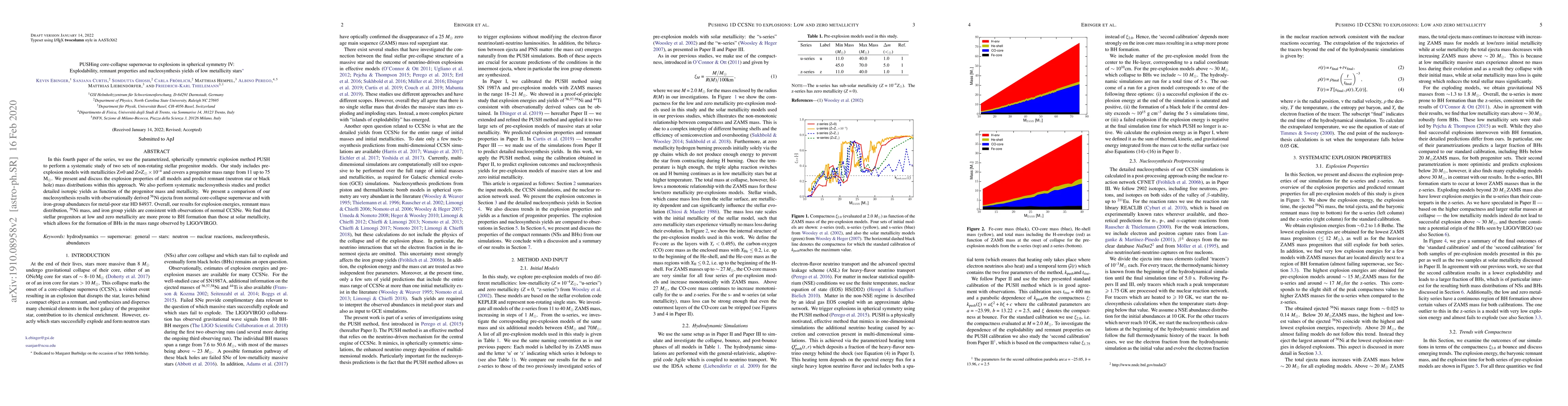 The paper presents a systematic study of low metallicity stellar progenitors using the PUSH method, providing detailed explosion properties, remnant mass distributions, and nucleosynthesis yields.