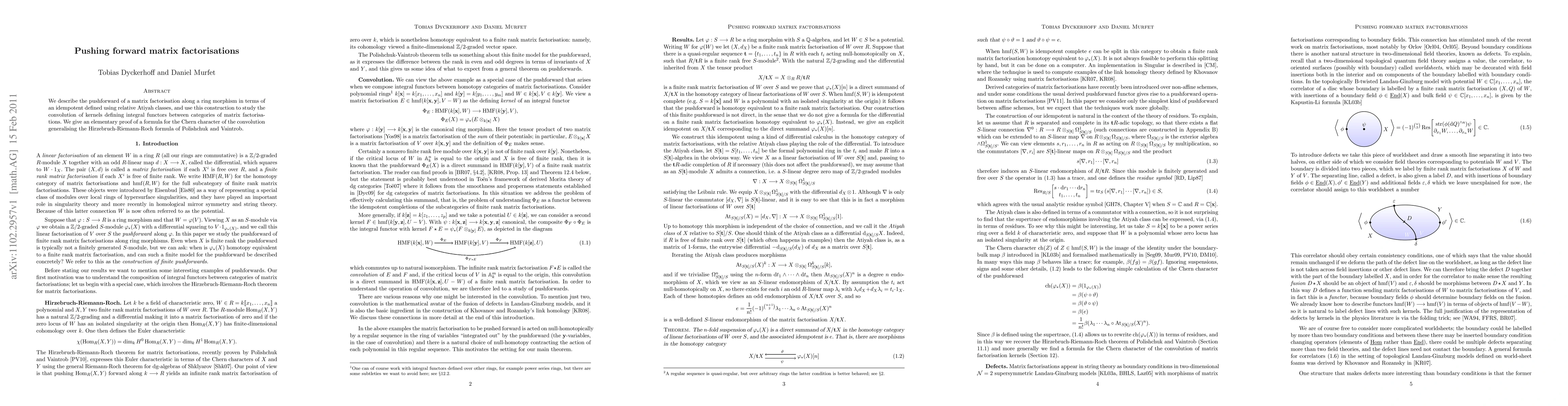 This paper explores the pushforward of matrix factorisations via ring morphisms, defining it through idempotents based on relative Atiyah classes. It also provides an elementary proof for a generalised Chern character formula for convolutions of kernels defining integral functors, extending the Hirzebruch-Riemann-Roch formula.