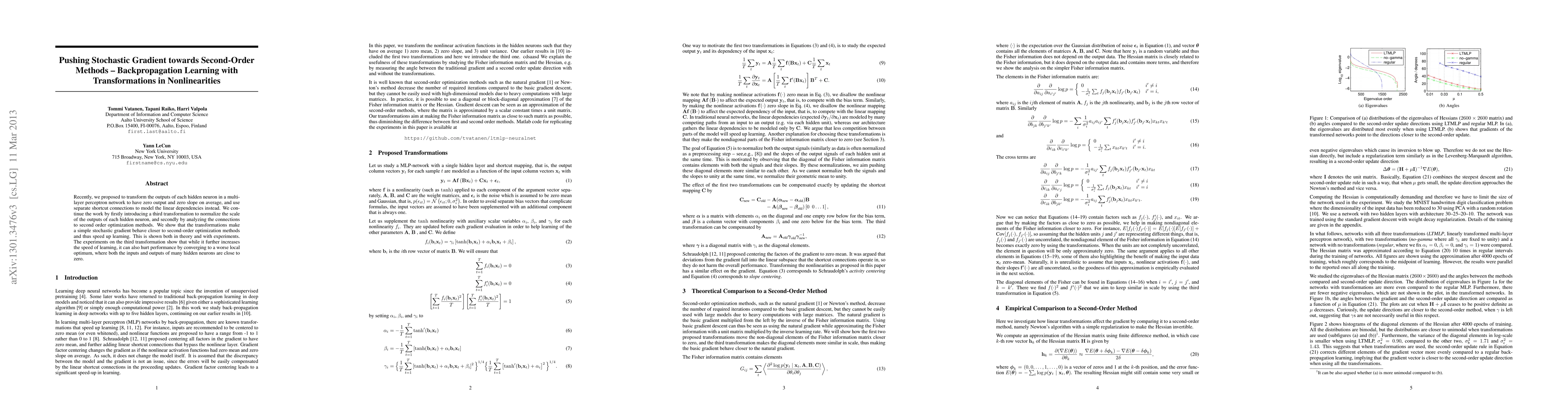 Recently, we proposed to transform the outputs of each hidden neuron in a multi-layer perceptron network to have zero output and zero slope on average, and use separate shortcut connections to model the linear dependencies instead. We continue the work by firstly introducing a third transformation to normalize the scale of the outputs of each hidden neuron, and secondly by analyzing the connections to second order optimization methods. We show that the transformations make a simple stochastic gradient behave closer to second-order optimization methods and thus speed up learning. This is shown both in theory and with experiments. The experiments on the third transformation show that while it further increases the speed of learning, it can also hurt performance by converging to a worse local optimum, where both the inputs and outputs of many hidden neurons are close to zero.