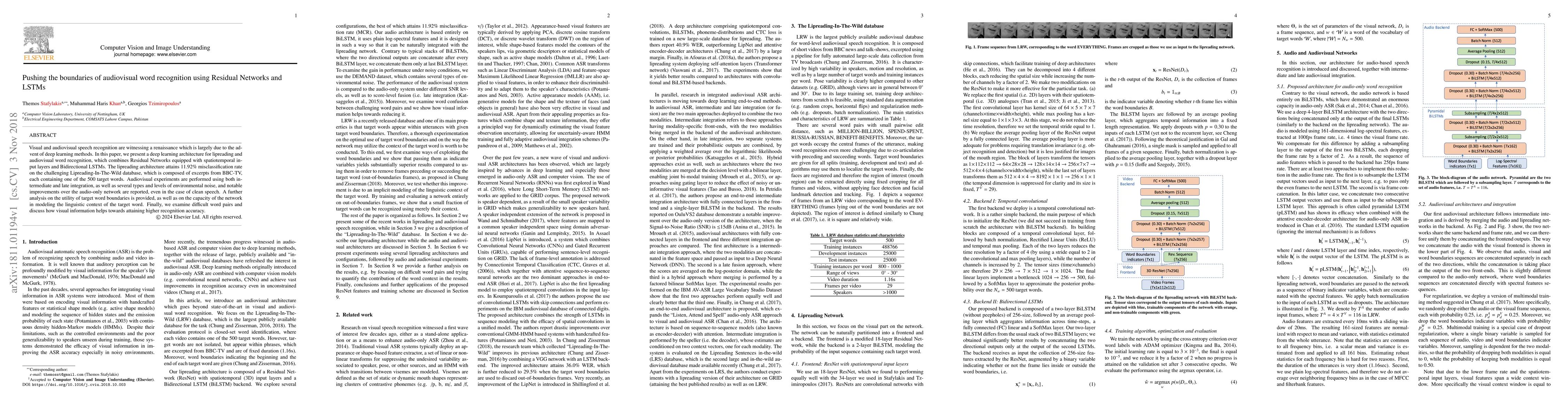 This paper introduces a deep learning architecture combining Residual Networks and Bidirectional LSTMs for lipreading and audiovisual word recognition, achieving a 11.92% misclassification rate on the Lipreading-In-The-Wild database. The study reports significant improvements over audio-only networks, even in clean speech conditions, and analyzes the impact of linguistic context and environmental noise.