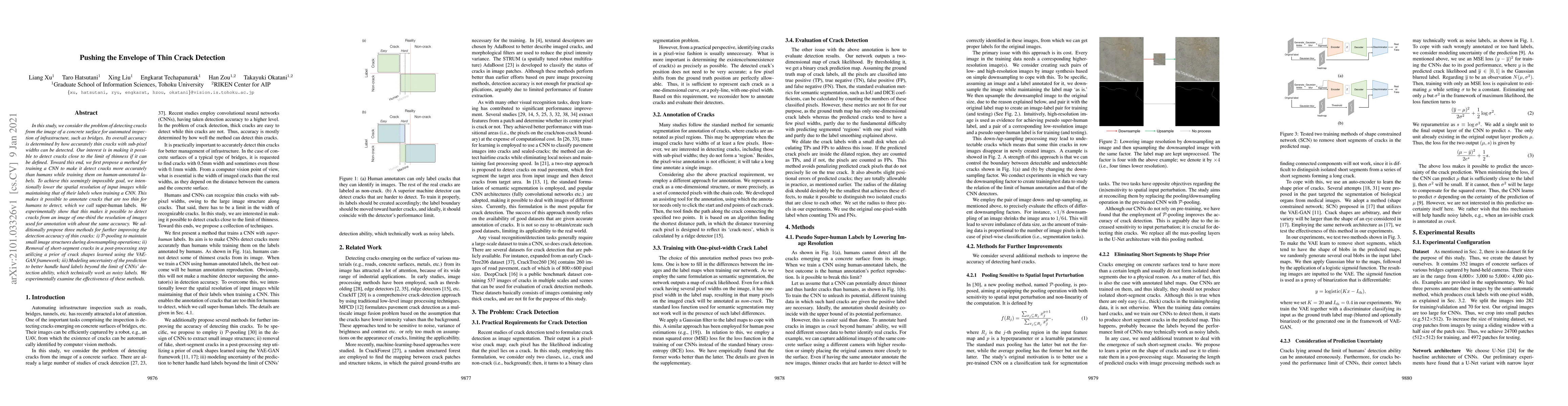 In this study, we consider the problem of detecting cracks from the image of a concrete surface for automated inspection of infrastructure, such as bridges. Its overall accuracy is determined by how accurately thin cracks with sub-pixel widths can be detected. Our interest is in making it possible to detect cracks close to the limit of thinness if it can be defined. Toward this end, we first propose a method for training a CNN to make it detect cracks more accurately than humans while training them on human-annotated labels. To achieve this seemingly impossible goal, we intentionally lower the spatial resolution of input images while maintaining that of their labels when training a CNN. This makes it possible to annotate cracks that are too thin for humans to detect, which we call super-human labels. We experimentally show that this makes it possible to detect cracks from an image of one-third the resolution of images used for annotation with about the same accuracy. We additionally propose three methods for further improving the detection accuracy of thin cracks: i) P-pooling to maintain small image structures during downsampling operations; ii) Removal of short-segment cracks in a post-processing step utilizing a prior of crack shapes learned using the VAE-GAN framework; iii) Modeling uncertainty of the prediction to better handle hard labels beyond the limit of CNNs' detection ability, which technically work as noisy labels. We experimentally examine the effectiveness of these methods.