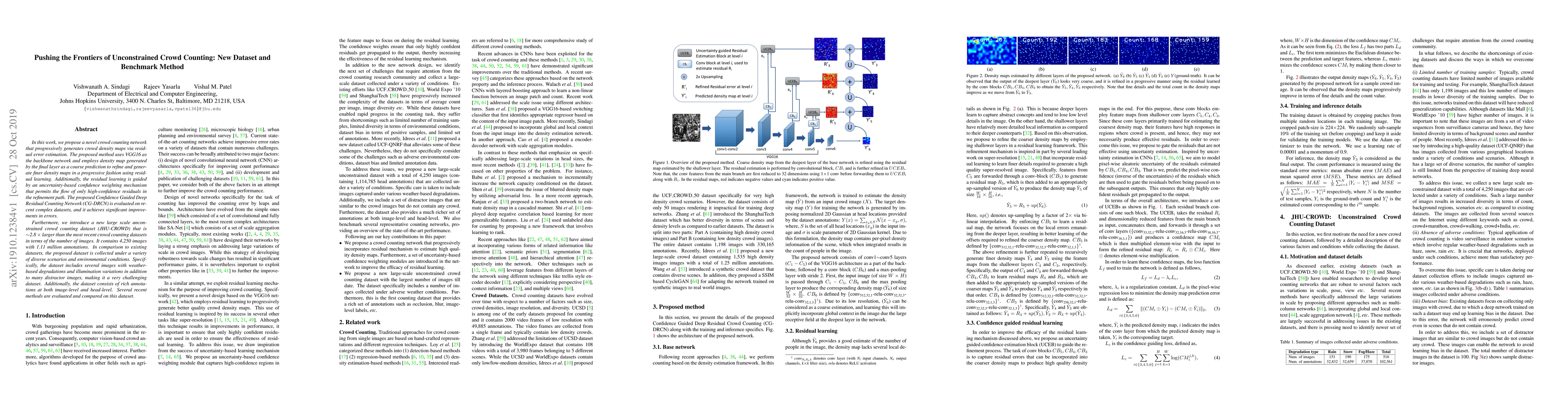 This paper introduces a novel Confidence Guided Deep Residual Counting Network (CG-DRCN) for crowd counting, which progressively refines density maps using residual learning. It also presents a new large-scale dataset, JHU-CROWD, featuring 4,250 images with diverse environmental conditions and challenging annotations.