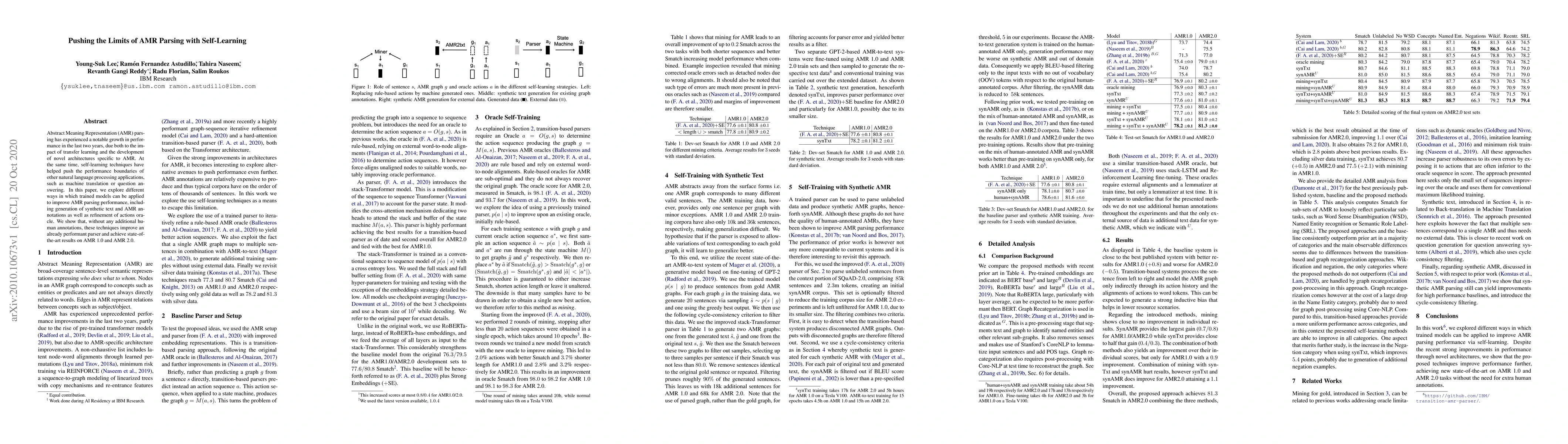 Abstract Meaning Representation (AMR) parsing has experienced a notable growth in performance in the last two years, due both to the impact of transfer learning and the development of novel architectures specific to AMR. At the same time, self-learning techniques have helped push the performance boundaries of other natural language processing applications, such as machine translation or question answering. In this paper, we explore different ways in which trained models can be applied to improve AMR parsing performance, including generation of synthetic text and AMR annotations as well as refinement of actions oracle. We show that, without any additional human annotations, these techniques improve an already performant parser and achieve state-of-the-art results on AMR 1.0 and AMR 2.0.