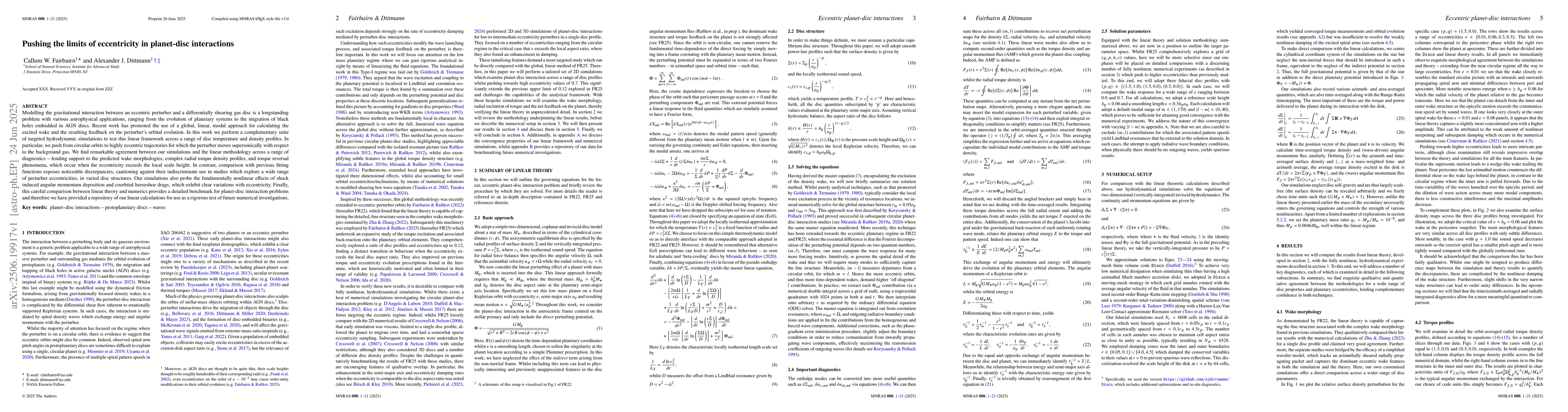 The research employs a global, linear, modal approach for calculating the excited wake and its feedback on orbital evolution, complemented by targeted hydrodynamic simulations to test this framework across various disc temperature and density profiles, pushing from circular to highly eccentric, supersonic orbits.