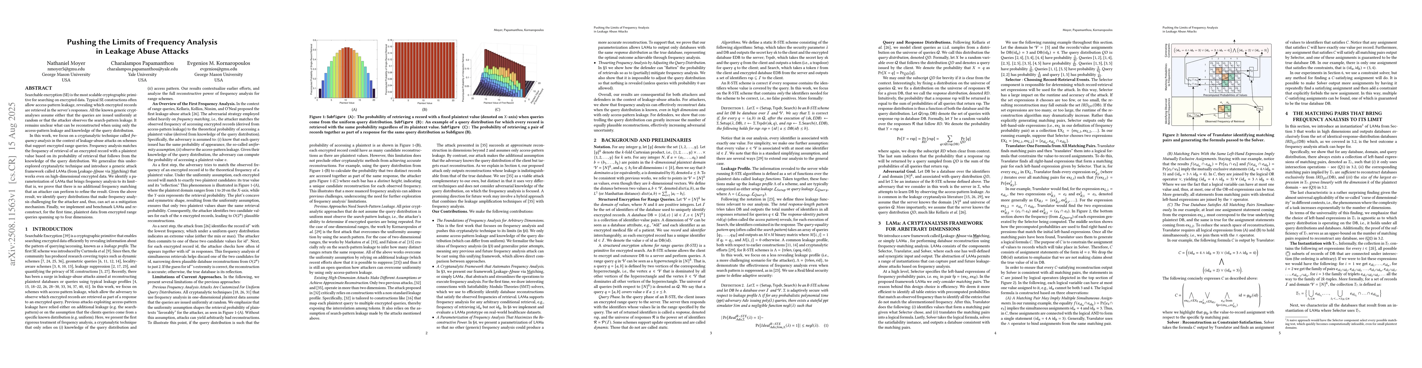 Searchable encryption (SE) is the most scalable cryptographic primitive for searching on encrypted data. Typical SE constructions often allow access-pattern leakage, revealing which encrypted records are retrieved in the server's responses. All the known generic cryptanalyses assume either that the queries are issued uniformly at random or that the attacker observes the search-pattern leakage. It remains unclear what can be reconstructed when using only the access-pattern leakage and knowledge of the query distribution. In this work, we focus on the cryptanalytic technique of frequency analysis in the context of leakage-abuse attacks on schemes that support encrypted range queries. Frequency analysis matches the frequency of retrieval of an encrypted record with a plaintext value based on its probability of retrieval that follows from the knowledge of the query distribution. We generalize this underexplored cryptanalytic technique and introduce a generic attack framework called Leakage-Abuse via Matching (LAMA) that works even on high-dimensional encrypted data. We identify a parameterization of LAMA that brings frequency analysis to its limit -- that is, we prove that there is no additional frequency matching that an attacker can perform to refine the result. Furthermore, we show that our results hold for any class of convex queries, and not just axis-aligned rectangles, which is the assumption in all other attacks on range schemes. Using these results, we identify query distributions that make frequency analysis challenging for the attacker and, thus, can act as a mitigation mechanism. Finally, we implement and benchmark LAMA and reconstruct, for the first time, plaintext data from encrypted range queries spanning up to four dimensions.