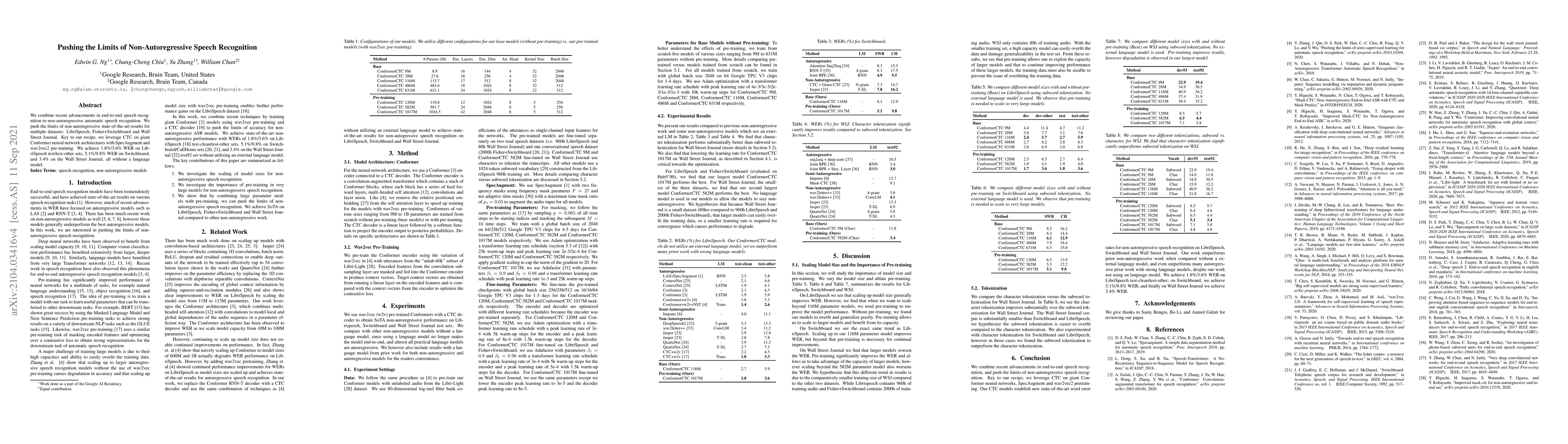 We combine recent advancements in end-to-end speech recognition to non-autoregressive automatic speech recognition. We push the limits of non-autoregressive state-of-the-art results for multiple datasets: LibriSpeech, Fisher+Switchboard and Wall Street Journal. Key to our recipe, we leverage CTC on giant Conformer neural network architectures with SpecAugment and wav2vec2 pre-training. We achieve 1.8%/3.6% WER on LibriSpeech test/test-other sets, 5.1%/9.8% WER on Switchboard, and 3.4% on the Wall Street Journal, all without a language model.