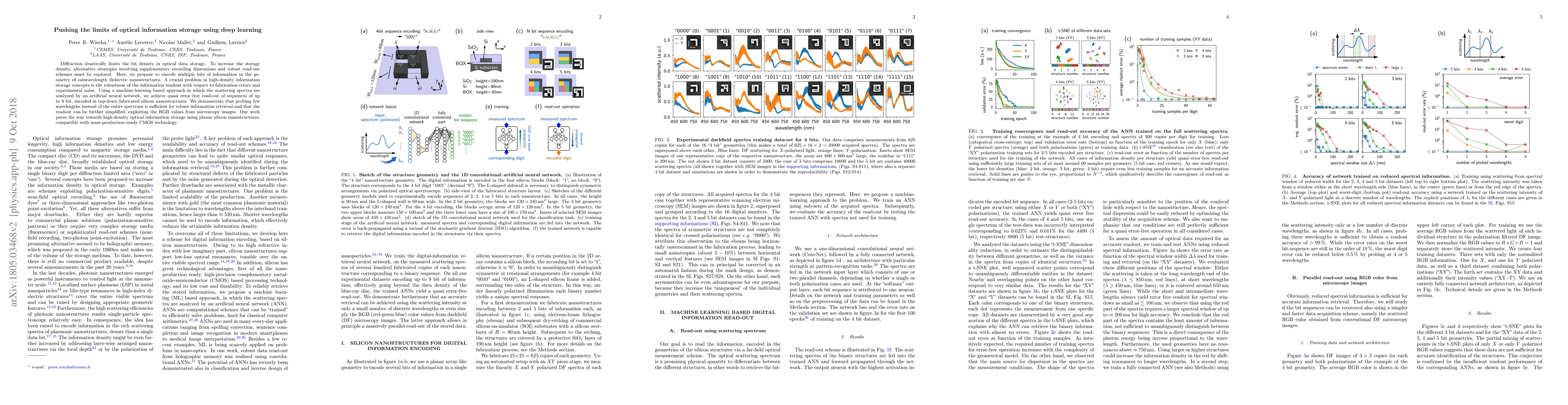 This paper proposes using deep learning to enhance the density of optical data storage by encoding multiple bits in subwavelength nanostructures. It demonstrates robust read-out of up to 9 bits using neural networks and shows that simplified probing methods, like RGB values from microscopy, can achieve quasi error-free retrieval.