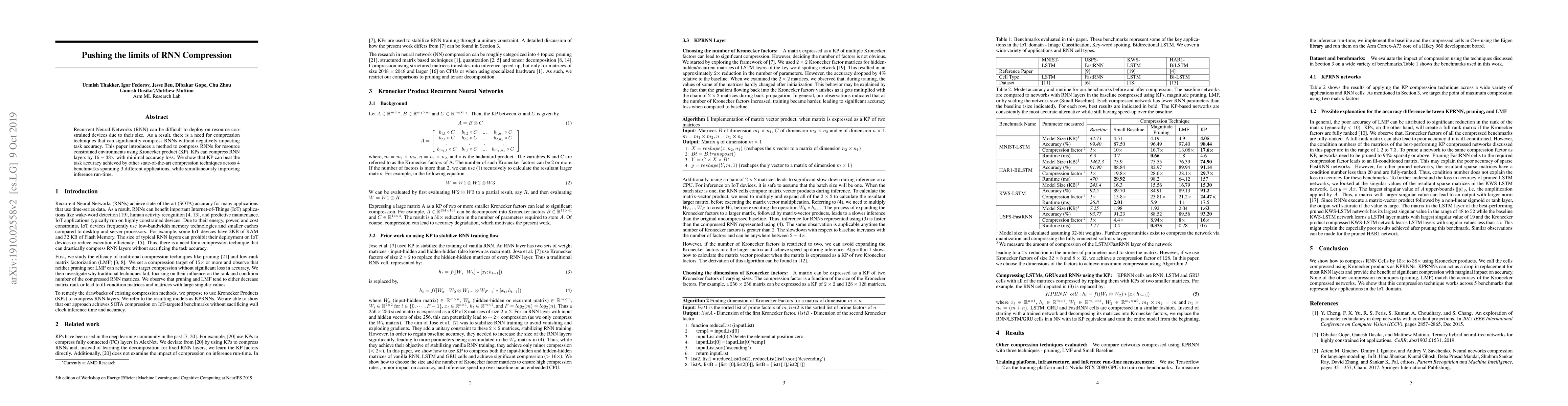 This paper proposes a novel compression technique using Kronecker products to significantly reduce the size of Recurrent Neural Networks (RNNs) by 16-38x with minimal loss in task accuracy, outperforming other state-of-the-art methods across 4 benchmarks in 3 different applications.