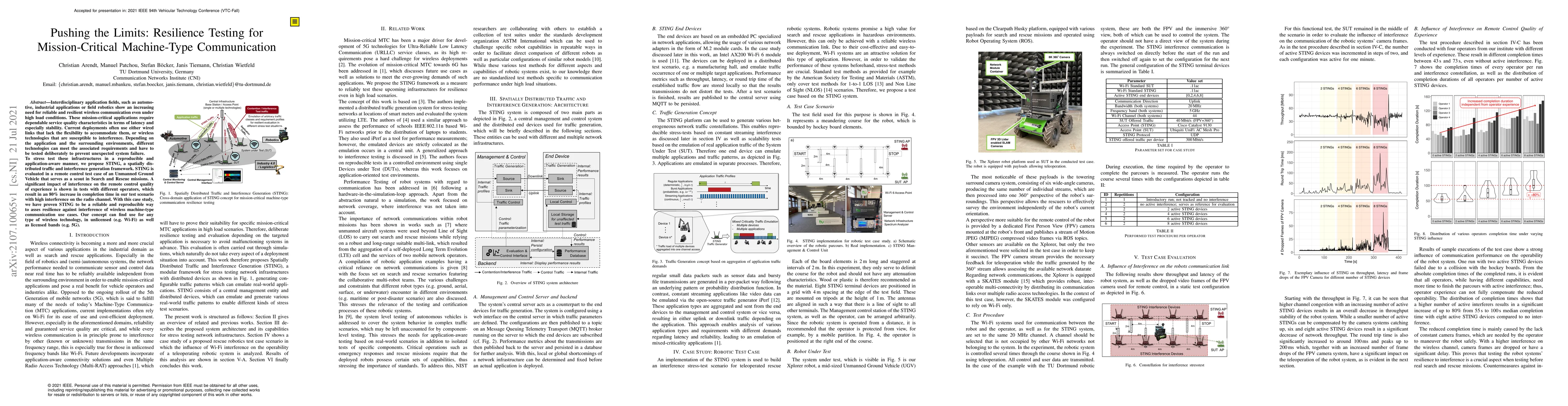 Interdisciplinary application fields, such as automotive, industrial applications or field robotics show an increasing need for reliable and resilient wireless communication even under high load conditions. These mission-critical applications require dependable service quality characteristics in terms of latency and especially stability. Current deployments often use either wired links that lack the flexibility to accommodate them, or wireless technologies that are susceptible to interference. Depending on the application and the surrounding environments, different technologies can meet the associated requirements and have to be tested deliberately to prevent unexpected system failure. To stress test these infrastructures in a reproducible and application-aware manner, we propose STING, a spatially distributed traffic and interference generation framework. STING is evaluated in a remote control test case of an Unmanned Ground Vehicle that serves as a scout in Search and Rescue missions. A significant impact of interference on the remote control quality of experience is shown in tests with different operators, which result in an 80% increase in completion time in our test scenario with high interference on the radio channel. With this case study, we have proven STING to be a reliable and reproducible way to asses resilience against interference of wireless machine-type communication use cases. Our concept can find use for any type of wireless technology, in unlicensed (e.g. Wi-Fi) as well as licensed bands (e.g. 5G).