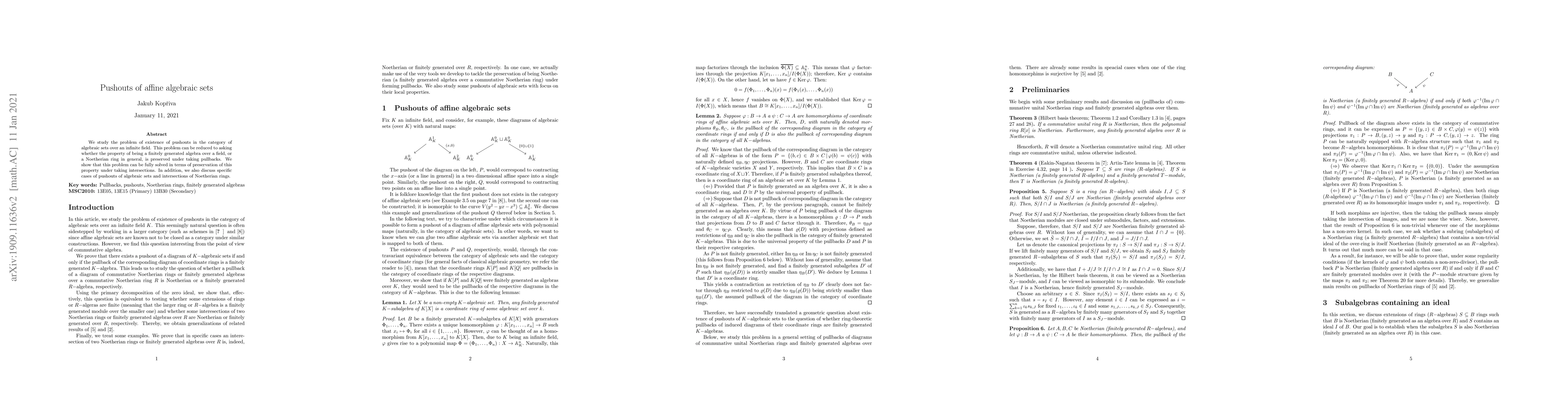 We study the problem of existence of pushouts in the category of algebraic sets over an infinite field. This problem can be reduced to asking whether the property of being a finitely generated algebra over a field, or a Noetherian ring in general, is preserved under taking pullbacks. We show that this problem can be fully solved in terms of preservation of this property under taking intersections. In addition, we also discuss specific cases of pushouts of algebraic sets and intersections of Noetherian rings.