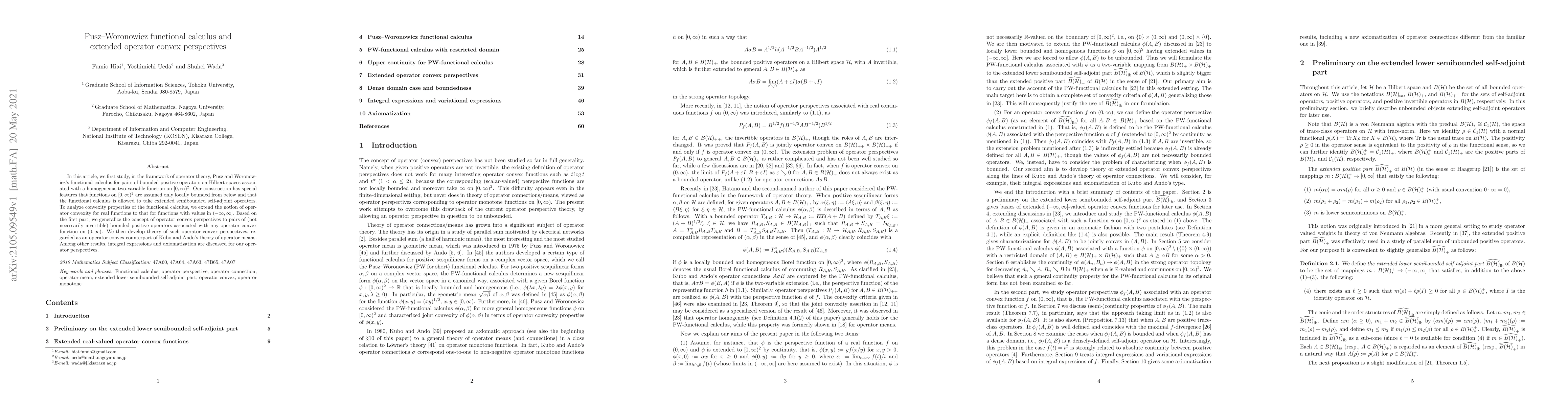 In this article, we first study, in the framework of operator theory, Pusz and Woronowicz's functional calculus for pairs of bounded positive operators on Hilbert spaces associated with a homogeneous two-variable function on $[0,\infty)^2$. Our construction has special features that functions on $[0,\infty)^2$ are assumed only locally bounded from below and that the functional calculus is allowed to take extended semibounded self-adjoint operators. To analyze convexity properties of the functional calculus, we extend the notion of operator convexity for real functions to that for functions with values in $(-\infty,\infty]$. Based on the first part, we generalize the concept of operator convex perspectives to pairs of (not necessarily invertible) bounded positive operators associated with any operator convex function on $(0,\infty)$. We then develop theory of such operator convex perspectives, regarded as an operator convex counterpart of Kubo and Ando's theory of operator means. Among other results, integral expressions and axiomatization are discussed for our operator perspectives.