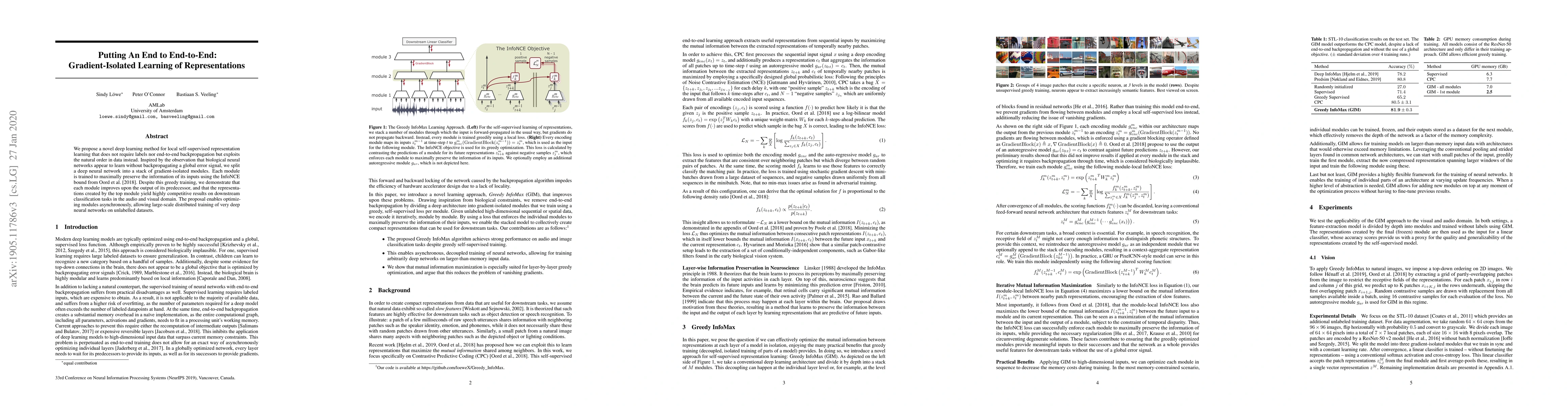 This paper introduces a novel self-supervised deep learning method that splits a neural network into gradient-isolated modules, each trained to preserve input information without end-to-end backpropagation. This approach enables large-scale distributed training on unlabeled data, yielding competitive representations for classification tasks.