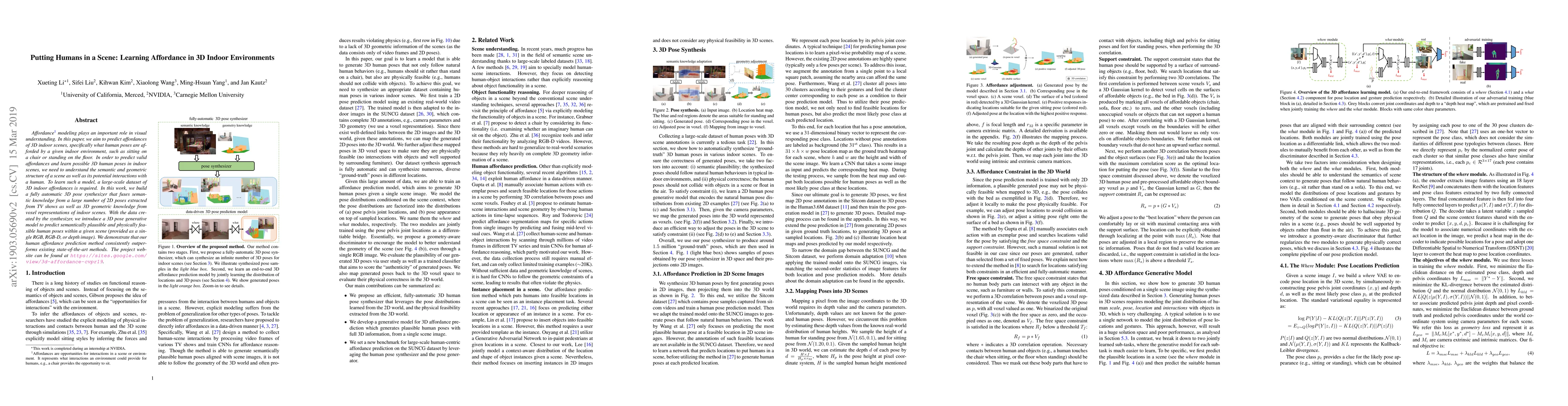 This paper develops a method to predict human poses in 3D indoor environments by modeling affordances, using a 3D pose synthesizer that combines semantic and geometric data. It introduces a generative model trained on synthesized data to predict plausible and feasible human poses, outperforming existing methods.