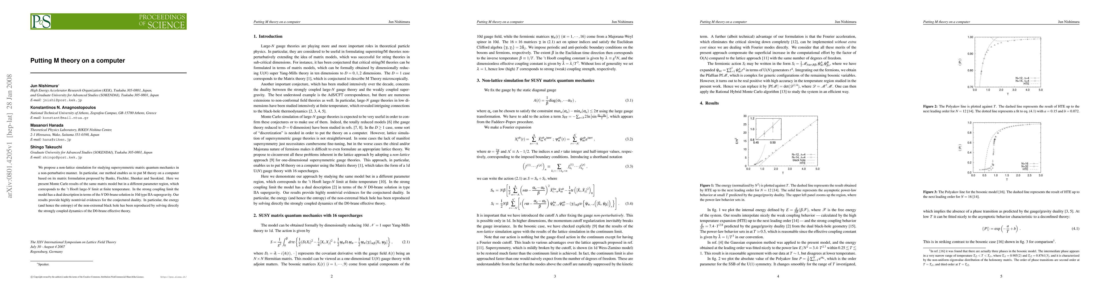 We propose a non-lattice simulation for studying supersymmetric matrix quantum mechanics in a non-perturbative manner. In particular, our method enables us to put M theory on a computer based on its matrix formulation proposed by Banks, Fischler, Shenker and Susskind. Here we present Monte Carlo results of the same matrix model but in a different parameter region, which corresponds to the 't Hooft large-N limit at finite temperature. In the strong coupling limit the model has a dual description in terms of the N D0-brane solution in 10d type IIA supergravity. Our results provide highly nontrivial evidences for the conjectured duality. In particular, the energy (and hence the entropy) of the non-extremal black hole has been reproduced by solving directly the strongly coupled dynamics of the D0-brane effective theory.