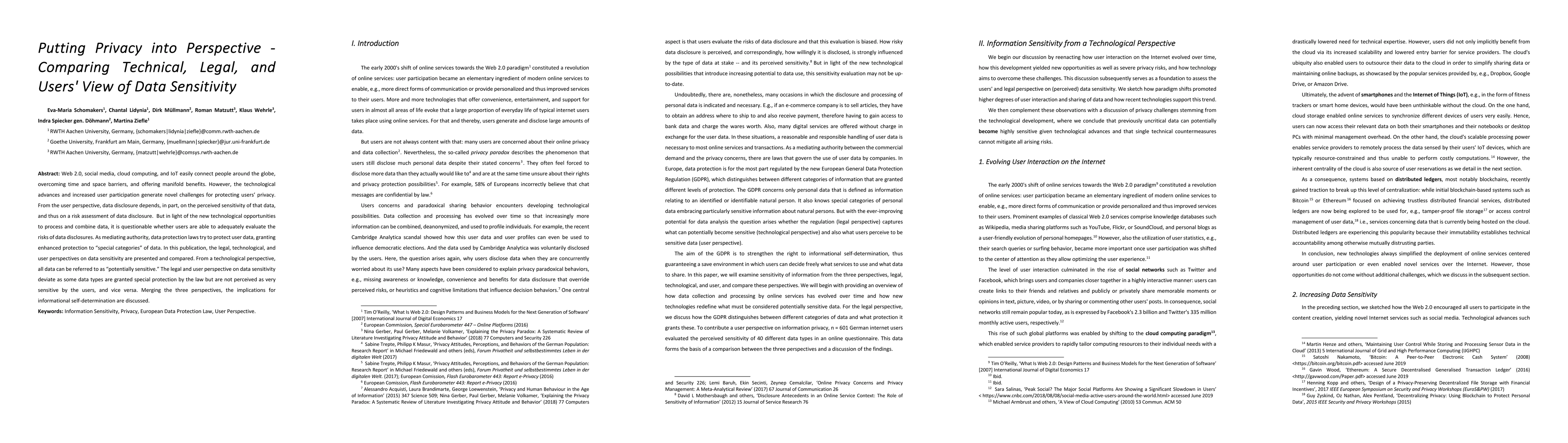 This study compares three perspectives on data sensitivity: legal, technological, and user; highlights discrepancies between perceived and protected sensitive data; and discusses implications for individual privacy control.