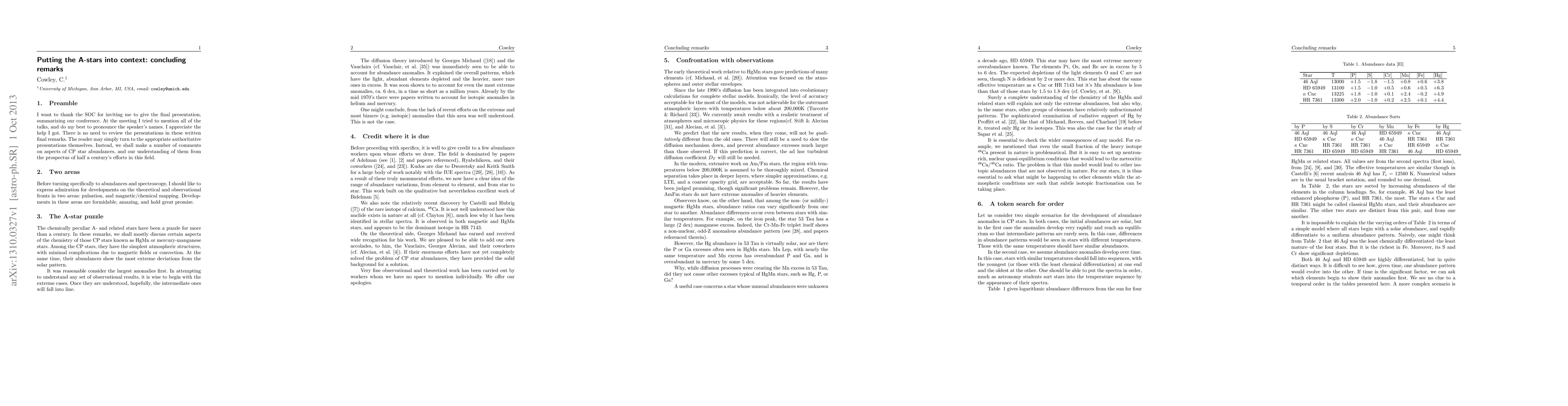 Concluding remarks following the international conference "Putting A Stars into Context," 3-7 June 2013 in Moscow. We argue that it is time for theoretical efforts to consider exogenous processes such as mass transfer or circumstellar infall as well as the standard endogenous processes of radiative levitation, gravitational settling, and mass-dependent separation in winds.