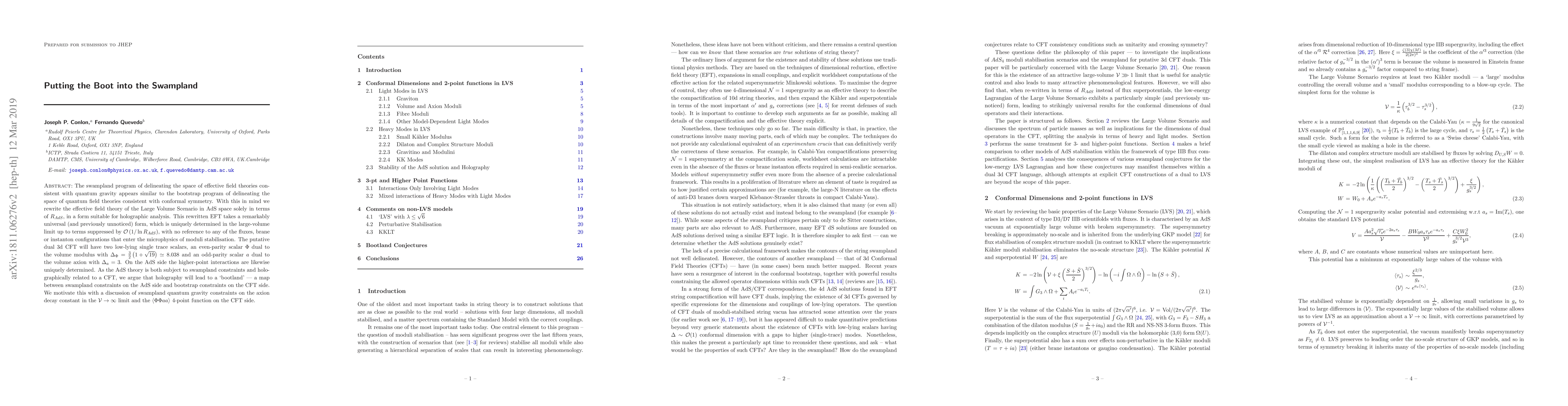 The swampland program of delineating the space of effective field theories consistent with quantum gravity appears similar to the bootstrap program of delineating the space of quantum field theories consistent with conformal symmetry. With this in mind we rewrite the effective field theory of the Large Volume Scenario in AdS space solely in terms of $R_{AdS}$, in a form suitable for holographic analysis. This rewritten EFT takes a remarkably universal (and previously unnoticed) form, which is uniquely determined in the large-volume limit up to terms suppressed by $\mathcal{O} \left( 1/\ln R_{AdS} \right)$, with no reference to any of the fluxes, brane or instanton configurations that enter the microphysics of moduli stabilisation. The putative dual 3d CFT will have two low-lying single trace scalars, an even-parity scalar $\Phi$ dual to the volume modulus with $\Delta_{\Phi} = \frac{3}{2}\left( 1 + \sqrt{19} \right) \simeq 8.038$ and an odd-parity scalar $a$ dual to the volume axion with $\Delta_a = 3$. On the AdS side the higher-point interactions are likewise uniquely determined. As the AdS theory is both subject to swampland constraints and holographically related to a CFT, we argue that holography will lead to a `bootland' --- a map between swampland constraints on the AdS side and bootstrap constraints on the CFT side. We motivate this with a discussion of swampland quantum gravity constraints on the axion decay constant in the $\mathcal{V} \to \infty$ limit and the $\langle \Phi \Phi a a \rangle$ 4-point function on the CFT side.