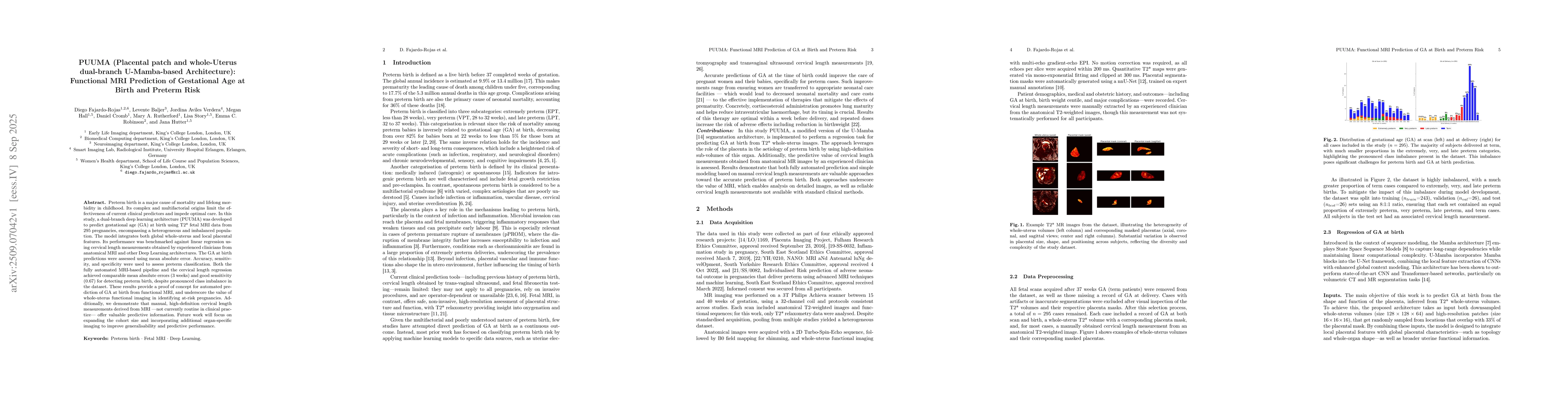 Preterm birth is a major cause of mortality and lifelong morbidity in childhood. Its complex and multifactorial origins limit the effectiveness of current clinical predictors and impede optimal care. In this study, a dual-branch deep learning architecture (PUUMA) was developed to predict gestational age (GA) at birth using T2* fetal MRI data from 295 pregnancies, encompassing a heterogeneous and imbalanced population. The model integrates both global whole-uterus and local placental features. Its performance was benchmarked against linear regression using cervical length measurements obtained by experienced clinicians from anatomical MRI and other Deep Learning architectures. The GA at birth predictions were assessed using mean absolute error. Accuracy, sensitivity, and specificity were used to assess preterm classification. Both the fully automated MRI-based pipeline and the cervical length regression achieved comparable mean absolute errors (3 weeks) and good sensitivity (0.67) for detecting preterm birth, despite pronounced class imbalance in the dataset. These results provide a proof of concept for automated prediction of GA at birth from functional MRI, and underscore the value of whole-uterus functional imaging in identifying at-risk pregnancies. Additionally, we demonstrate that manual, high-definition cervical length measurements derived from MRI, not currently routine in clinical practice, offer valuable predictive information. Future work will focus on expanding the cohort size and incorporating additional organ-specific imaging to improve generalisability and predictive performance.