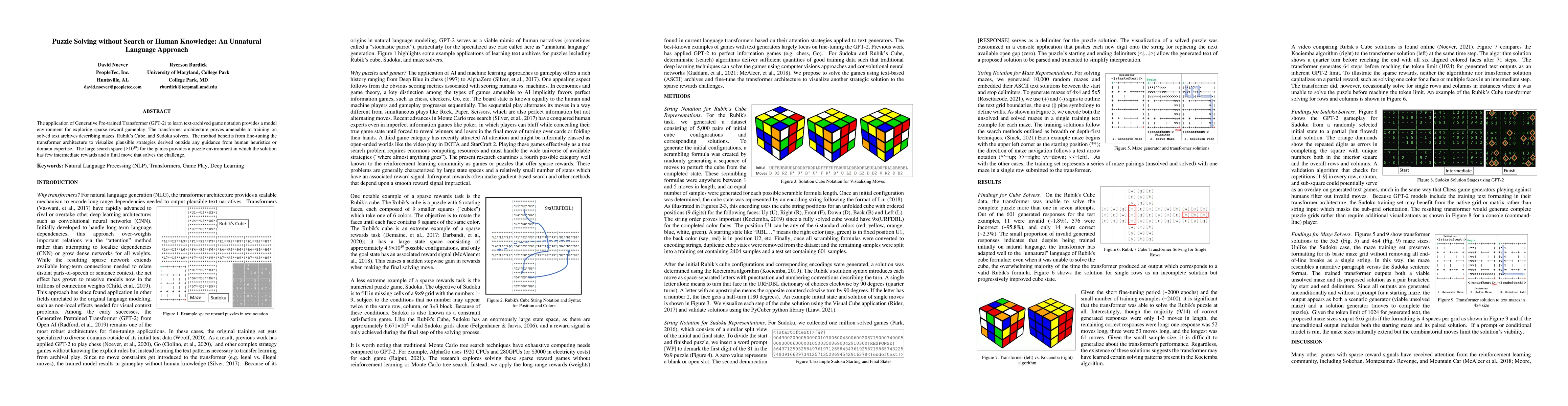 The application of Generative Pre-trained Transformer (GPT-2) to learn text-archived game notation provides a model environment for exploring sparse reward gameplay. The transformer architecture proves amenable to training on solved text archives describing mazes, Rubik's Cube, and Sudoku solvers. The method benefits from fine-tuning the transformer architecture to visualize plausible strategies derived outside any guidance from human heuristics or domain expertise. The large search space ($>10^{19}$) for the games provides a puzzle environment in which the solution has few intermediate rewards and a final move that solves the challenge.