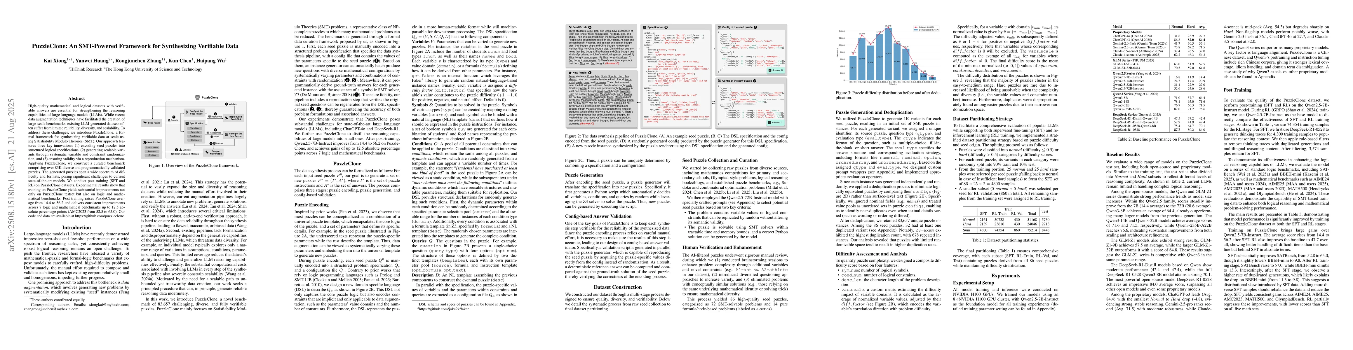 High-quality mathematical and logical datasets with verifiable answers are essential for strengthening the reasoning capabilities of large language models (LLMs). While recent data augmentation techniques have facilitated the creation of large-scale benchmarks, existing LLM-generated datasets often suffer from limited reliability, diversity, and scalability. To address these challenges, we introduce PuzzleClone, a formal framework for synthesizing verifiable data at scale using Satisfiability Modulo Theories (SMT). Our approach features three key innovations: (1) encoding seed puzzles into structured logical specifications, (2) generating scalable variants through systematic variable and constraint randomization, and (3) ensuring validity via a reproduction mechanism. Applying PuzzleClone, we construct a curated benchmark comprising over 83K diverse and programmatically validated puzzles. The generated puzzles span a wide spectrum of difficulty and formats, posing significant challenges to current state-of-the-art models. We conduct post training (SFT and RL) on PuzzleClone datasets. Experimental results show that training on PuzzleClone yields substantial improvements not only on PuzzleClone testset but also on logic and mathematical benchmarks. Post training raises PuzzleClone average from 14.4 to 56.2 and delivers consistent improvements across 7 logic and mathematical benchmarks up to 12.5 absolute percentage points (AMC2023 from 52.5 to 65.0). Our code and data are available at https://github.com/puzzleclone.