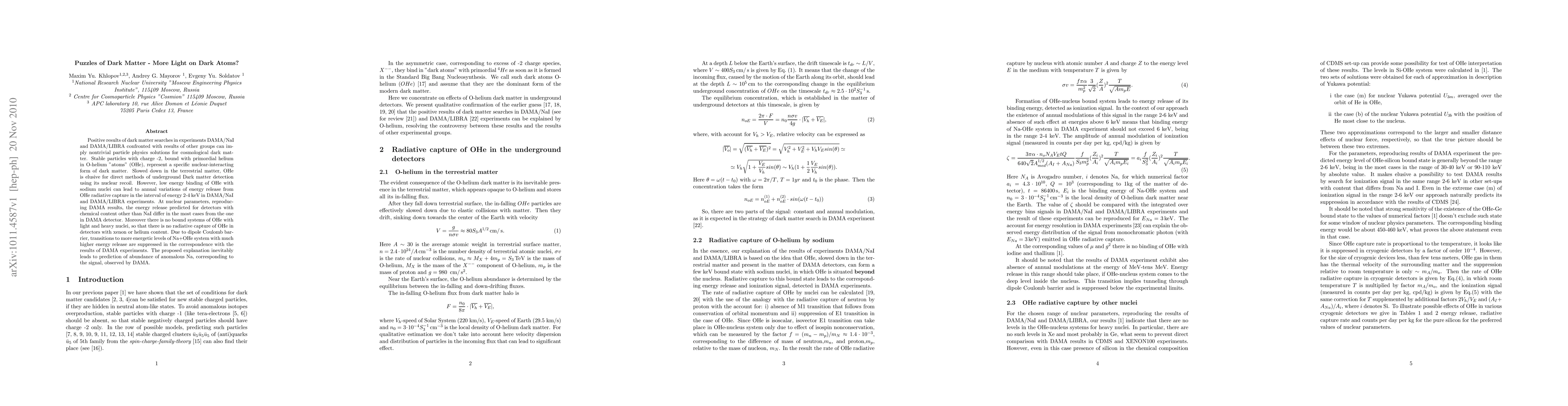 This paper explores the possibility of dark matter in the form of stable, charged particles (-2 charge) bound in O-helium "atoms" (OHe) that could explain positive results from DAMA/NaI and DAMA/LIBRA experiments. It predicts that OHe interacts differently with various detector materials, leading to distinct energy releases and explaining the discrepancy between DAMA results and other experiments.