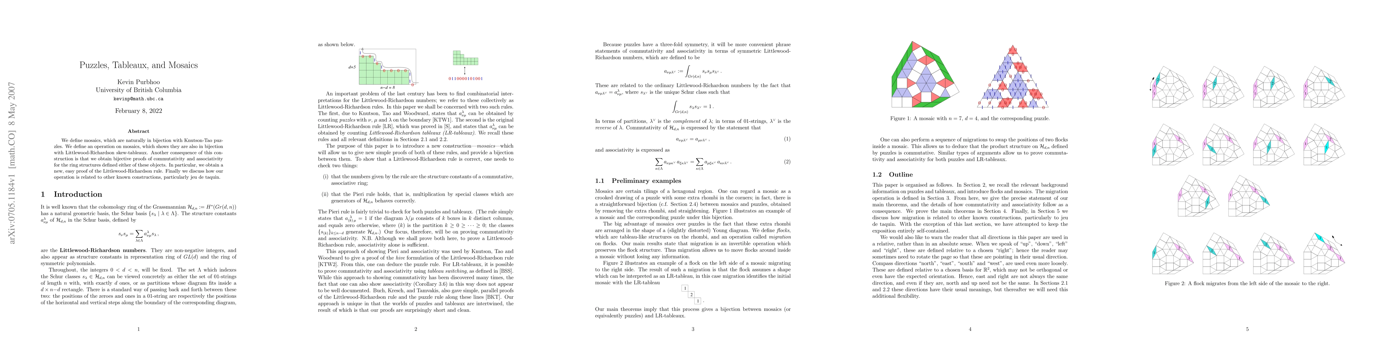 Researchers establish a connection between mosaics, Knutson-Tao puzzles, and Littlewood-Richardson skew-tableaux, providing bijective proofs for commutativity and associativity in ring structures.