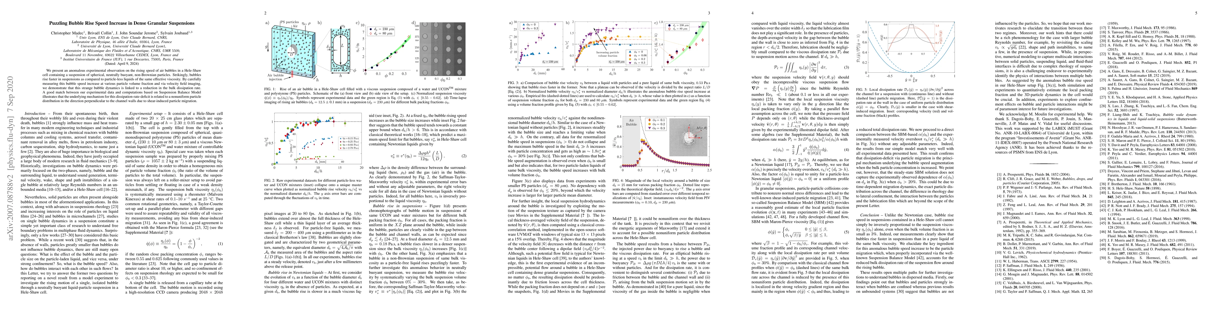 This research observes that air bubbles rise faster in dense granular suspensions than in particle-free liquids of the same viscosity, attributing this to reduced bulk dissipation caused by non-uniform particle distribution induced by shear-induced migration.