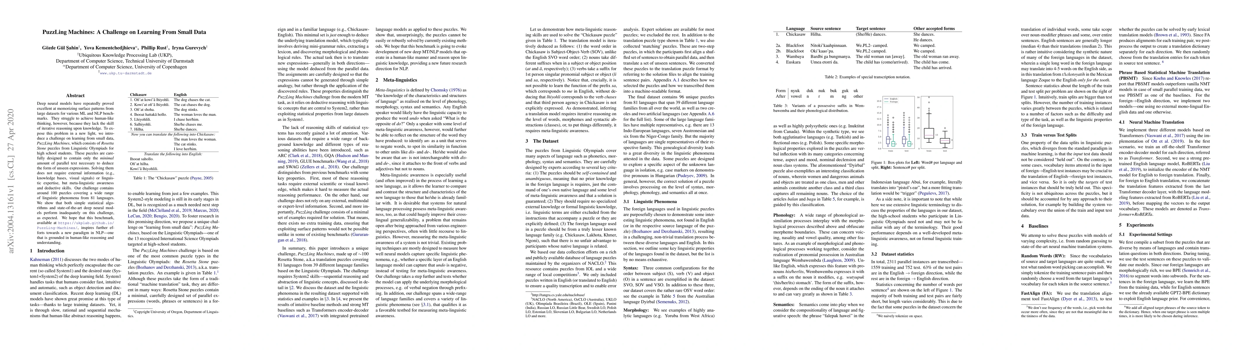 Deep neural models have repeatedly proved excellent at memorizing surface patterns from large datasets for various ML and NLP benchmarks. They struggle to achieve human-like thinking, however, because they lack the skill of iterative reasoning upon knowledge. To expose this problem in a new light, we introduce a challenge on learning from small data, PuzzLing Machines, which consists of Rosetta Stone puzzles from Linguistic Olympiads for high school students. These puzzles are carefully designed to contain only the minimal amount of parallel text necessary to deduce the form of unseen expressions. Solving them does not require external information (e.g., knowledge bases, visual signals) or linguistic expertise, but meta-linguistic awareness and deductive skills. Our challenge contains around 100 puzzles covering a wide range of linguistic phenomena from 81 languages. We show that both simple statistical algorithms and state-of-the-art deep neural models perform inadequately on this challenge, as expected. We hope that this benchmark, available at https://ukplab.github.io/PuzzLing-Machines/, inspires further efforts towards a new paradigm in NLP---one that is grounded in human-like reasoning and understanding.