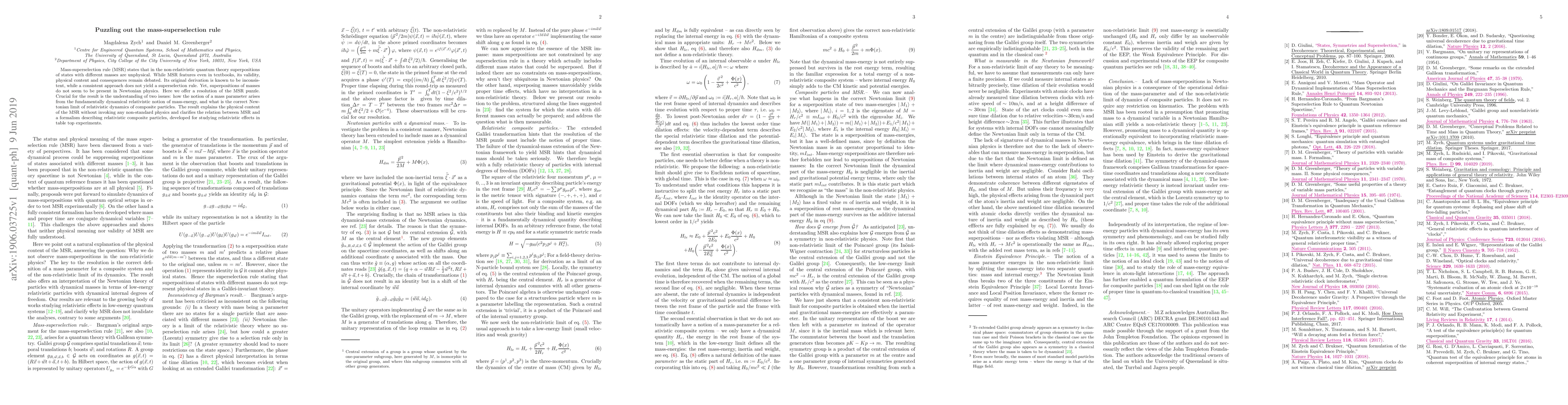 This paper resolves the mass-superselection rule (MSR) by addressing how mass emerges from relativistic mass-energy and the correct Newtonian limit of relativistic dynamics. It clarifies MSR's physical content without non-standard physics and links it to a formalism for studying relativistic effects in composite particles.