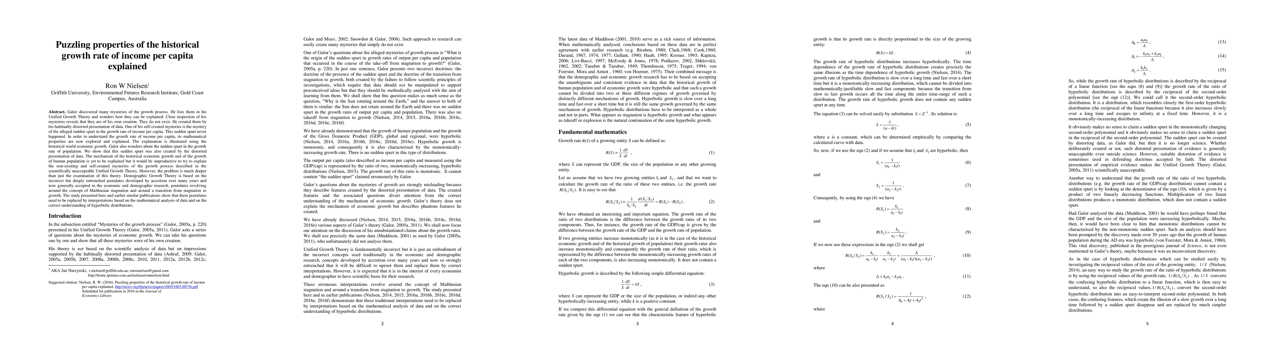 Galor discovered many mysteries of the growth process. He lists them in his Unified Growth Theory and wonders how they can be explained. Close inspection of his mysteries reveals that they are of his own creation. They do not exist. He created them by his habitually distorted presentation of data. One of his self-created mysteries is the mystery of the alleged sudden spurt in the growth rate of income per capita. This sudden spurt never happened. In order to understand the growth rate of income per capita, its mathematical properties are now explored and explained. The explanation is illustrated using the historical world economic growth. Galor also wonders about the sudden spurt in the growth rate of population. We show that this sudden spurt was also created by the distorted presentation of data. The mechanism of the historical economic growth and of the growth of human population is yet to be explained but it would be unproductive to try to explain the non-existing and self-created mysteries of the growth process described in the scientifically unacceptable Unified Growth Theory. However, the problem is much deeper than just the examination of this theory. Demographic Growth Theory is based on the incorrect but deeply entrenched postulates developed by accretion over many years and now generally accepted in the economic and demographic research, postulates revolving around the concept of Malthusian stagnation and around a transition from stagnation to growth. The study presented here and earlier similar publications show that these postulates need to be replaced by interpretations based on the mathematical analysis of data and on the correct understanding of hyperbolic distributions.