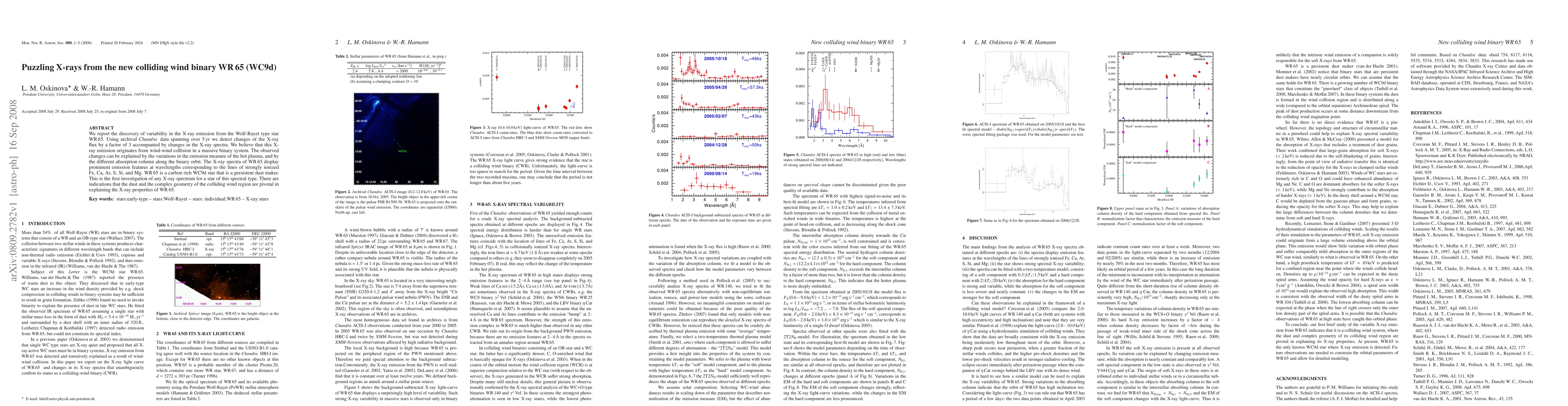 We report the discovery of variability in the X-ray emission from the Wolf-Rayet type star WR 65. Using archival Chandra data spanning over 5 yr we detect changes of the X-ray flux by a factor of 3 accompanied by changes in the X-ray spectra. We believe that this X-ray emission originates from wind-wind collision in a massive binary system. The observed changes can be explained by the variations in the emission measure of the hot plasma, and by the different absorption column along the binary orbit. The X-ray spectra of WR 65 display prominent emission features at wavelengths corresponding to the lines of strongly ionized Fe, Ca, Ar, S, Si, and Mg. WR 65 is a carbon rich WC9d star that is a persistent dust maker. This is the first investigation of any X-ray spectrum for a star of this spectral type. There are indications that the dust and the complex geometry of the colliding wind region are pivotal in explaining the X-ray properties of WR 65.
