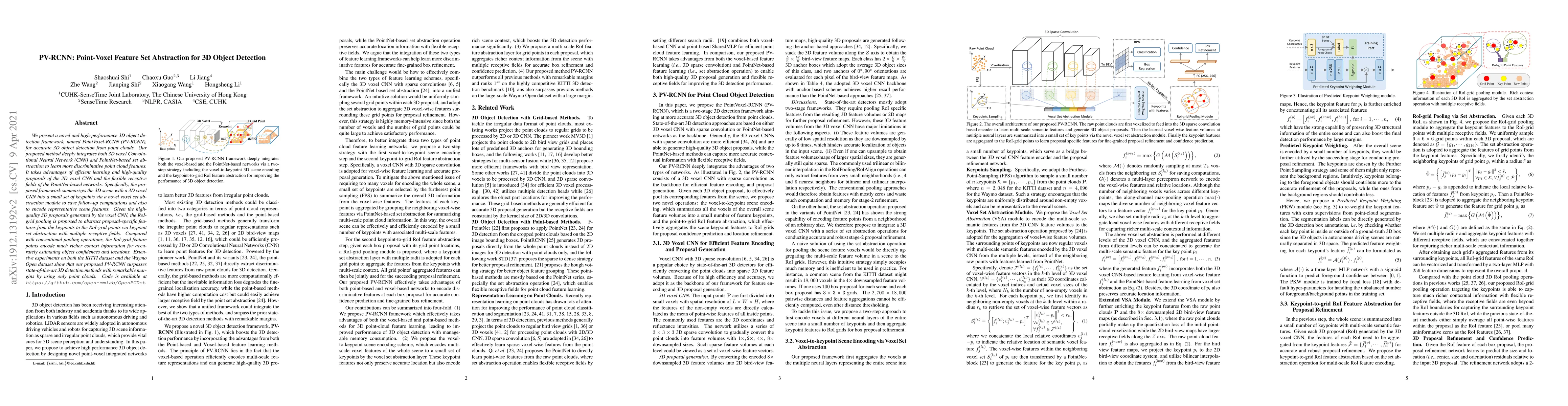 PV-RCNN integrates 3D voxel CNN and PointNet-based set abstraction for efficient and accurate 3D object detection from point clouds, achieving state-of-the-art performance on KITTI and Waymo Open datasets. The method uses voxel set abstraction and RoI-grid pooling to encode rich context information for precise object detection.