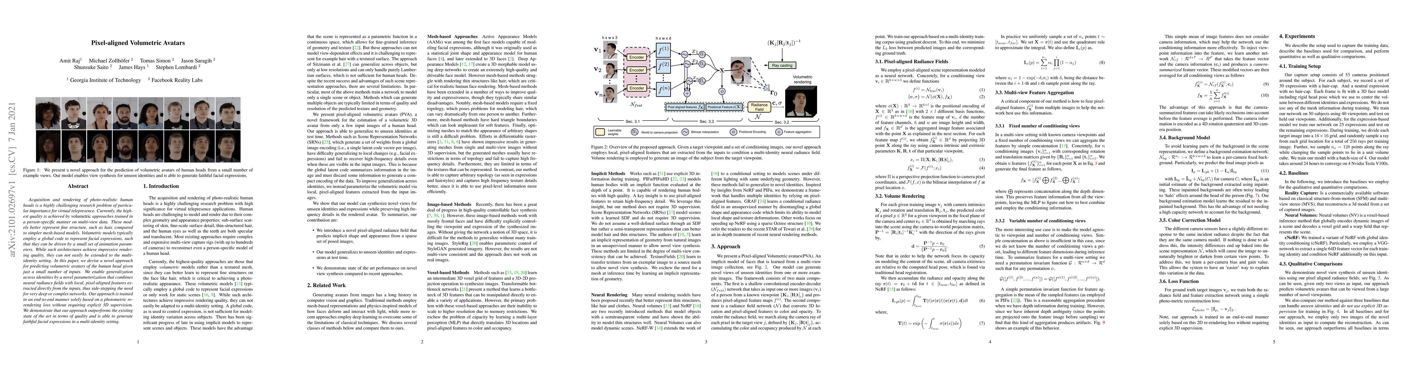 Acquisition and rendering of photo-realistic human heads is a highly challenging research problem of particular importance for virtual telepresence. Currently, the highest quality is achieved by volumetric approaches trained in a person specific manner on multi-view data. These models better represent fine structure, such as hair, compared to simpler mesh-based models. Volumetric models typically employ a global code to represent facial expressions, such that they can be driven by a small set of animation parameters. While such architectures achieve impressive rendering quality, they can not easily be extended to the multi-identity setting. In this paper, we devise a novel approach for predicting volumetric avatars of the human head given just a small number of inputs. We enable generalization across identities by a novel parameterization that combines neural radiance fields with local, pixel-aligned features extracted directly from the inputs, thus sidestepping the need for very deep or complex networks. Our approach is trained in an end-to-end manner solely based on a photometric re-rendering loss without requiring explicit 3D supervision.We demonstrate that our approach outperforms the existing state of the art in terms of quality and is able to generate faithful facial expressions in a multi-identity setting.