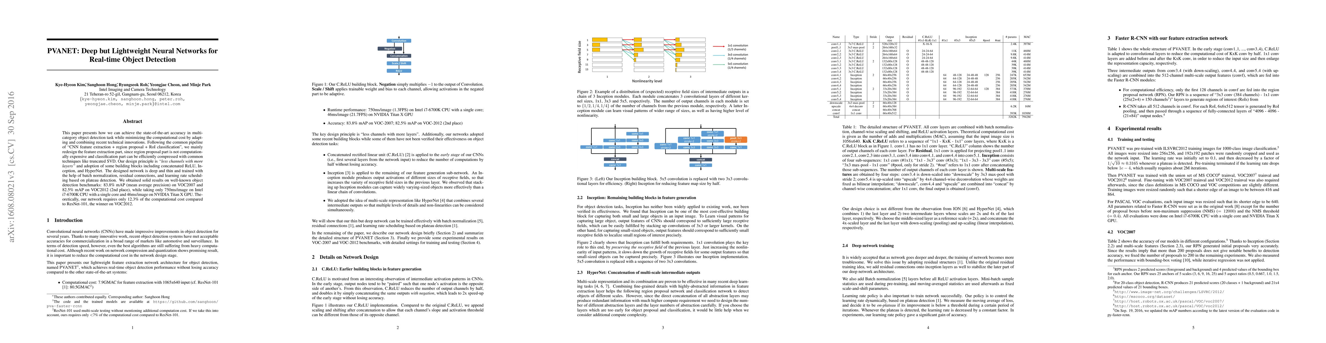 This paper presents how we can achieve the state-of-the-art accuracy in multi-category object detection task while minimizing the computational cost by adapting and combining recent technical innovations. Following the common pipeline of "CNN feature extraction + region proposal + RoI classification", we mainly redesign the feature extraction part, since region proposal part is not computationally expensive and classification part can be efficiently compressed with common techniques like truncated SVD. Our design principle is "less channels with more layers" and adoption of some building blocks including concatenated ReLU, Inception, and HyperNet. The designed network is deep and thin and trained with the help of batch normalization, residual connections, and learning rate scheduling based on plateau detection. We obtained solid results on well-known object detection benchmarks: 83.8% mAP (mean average precision) on VOC2007 and 82.5% mAP on VOC2012 (2nd place), while taking only 750ms/image on Intel i7-6700K CPU with a single core and 46ms/image on NVIDIA Titan X GPU. Theoretically, our network requires only 12.3% of the computational cost compared to ResNet-101, the winner on VOC2012.