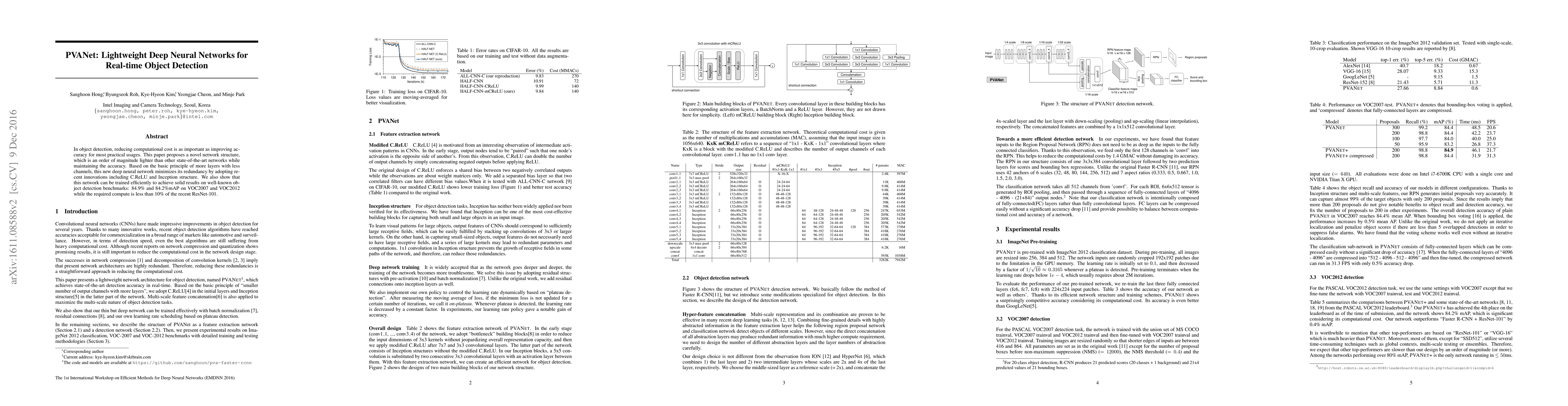 PVANet introduces a lightweight deep neural network for real-time object detection, achieving high accuracy while significantly reducing computational cost by a factor of ten compared to state-of-the-art networks like ResNet-101. The network employs innovative techniques like C.ReLU and Inception structure to minimize redundancy.