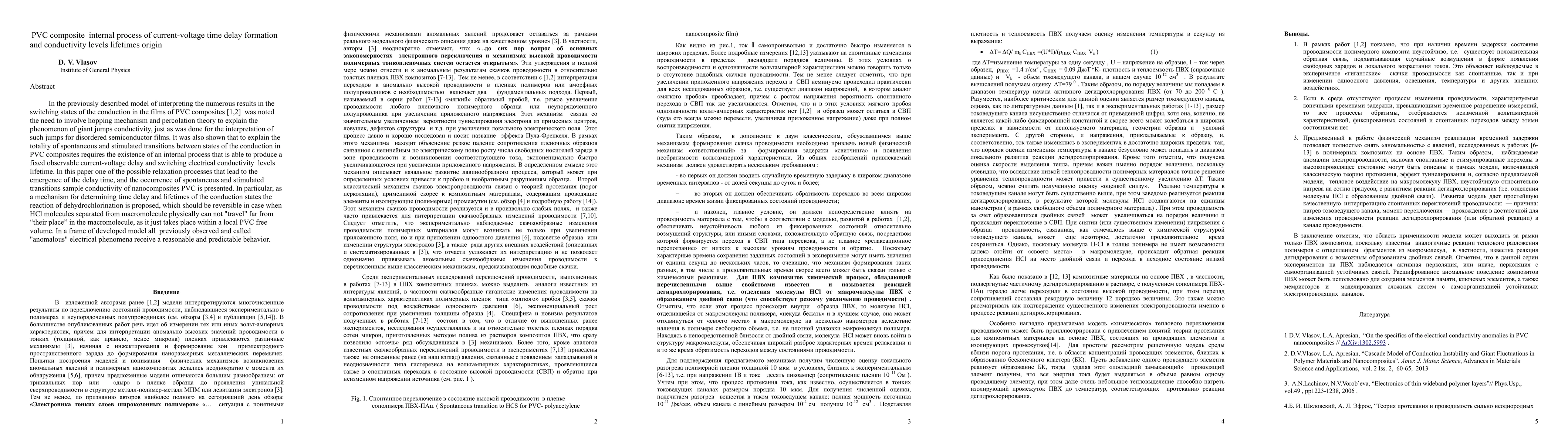 In the previously described model of interpreting the numerous results in the switching states of the conduction in the films of PVC composites [1,2] was noted the need to involve hopping mechanism and percolation theory to explain the phenomenon of giant jumps conductivity, just as was done for the interpretation of such jumps for disordered semiconductor films. It was also shown that to explain the totality of spontaneous and stimulated transitions between states of the conduction in PVC composites requires the existence of an internal process that is able to produce a fixed observable current - voltage delay and switching electrical conductivity levels lifetime. In this paper one of the possible relaxation processes that lead to the emergence of the delay time, and the occurrence of spontaneous and stimulated transitions sample conductivity of nanocomposites PVC is presented. In particular, as a mechanism for determining time delay and lifetimes of the conduction states the reaction of dehydrochlorination is proposed, which should be reversible in case when HCl molecules separated from macromolecule physically can not "travel" far from "their place" in the macromolecule, as it just takes place within a local PVC free volume. In a frame of developed model all previously observed and called "anomalous" electrical phenomena receive a reasonable and predictable behavior.