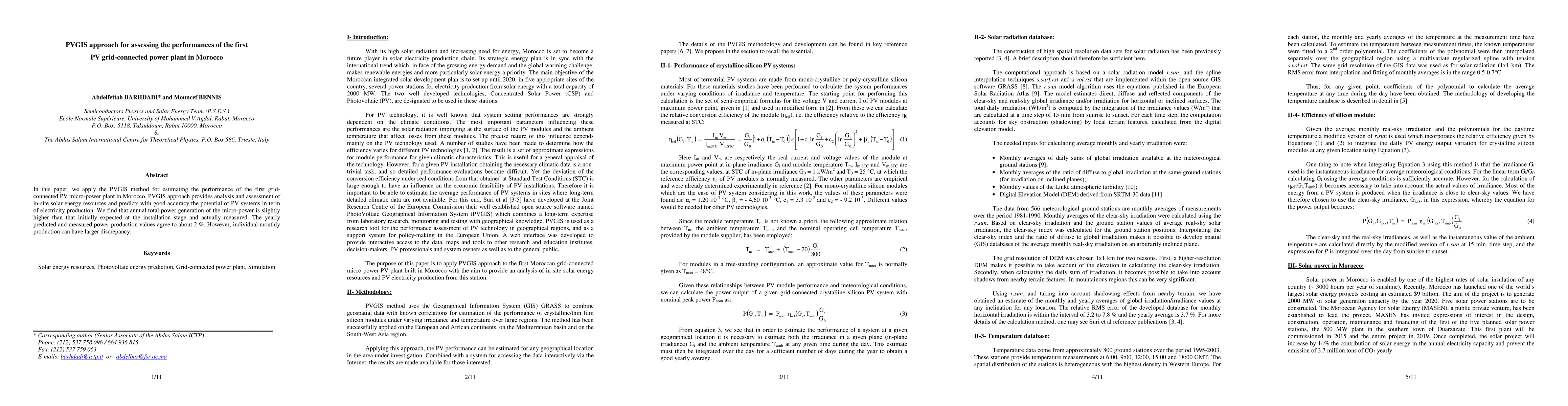 In this paper, we apply the PVGIS method for estimating the performance of the first grid-connected PV micro-power plant in Morocco. PVGIS approach provides analysis and assessment of in-site solar energy resources and predicts with good accuracy the potential of PV systems in term of electricity production. We find that annual total power generation of the micro-power is slightly higher than that initially expected at the installation stage and actually measured. The yearly predicted and measured power production values agree to about 2 %. However, individual monthly production can have larger discrepancy.