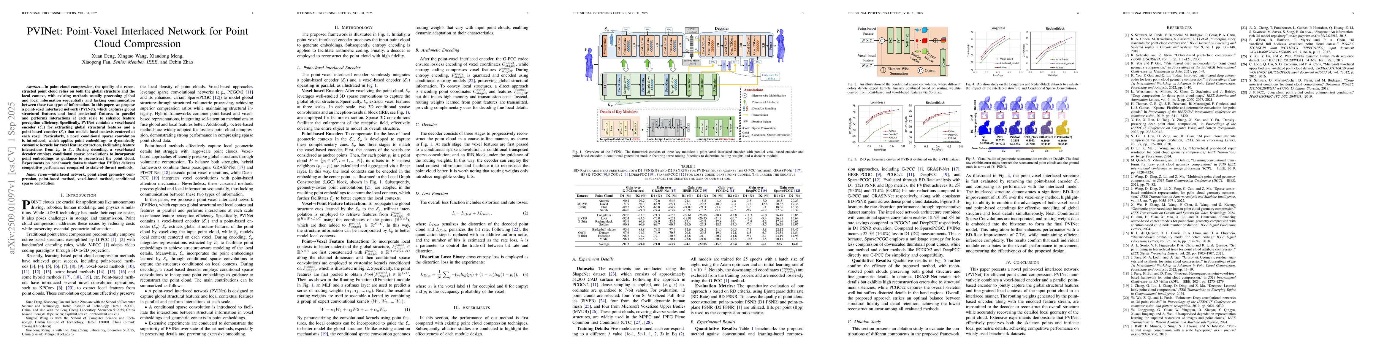 In point cloud compression, the quality of a reconstructed point cloud relies on both the global structure and the local context, with existing methods usually processing global and local information sequentially and lacking communication between these two types of information. In this paper, we propose a point-voxel interlaced network (PVINet), which captures global structural features and local contextual features in parallel and performs interactions at each scale to enhance feature perception efficiency. Specifically, PVINet contains a voxel-based encoder (Ev) for extracting global structural features and a point-based encoder (Ep) that models local contexts centered at each voxel. Particularly, a novel conditional sparse convolution is introduced, which applies point embeddings to dynamically customize kernels for voxel feature extraction, facilitating feature interactions from Ep to Ev. During decoding, a voxel-based decoder employs conditional sparse convolutions to incorporate point embeddings as guidance to reconstruct the point cloud. Experiments on benchmark datasets show that PVINet delivers competitive performance compared to state-of-the-art methods.