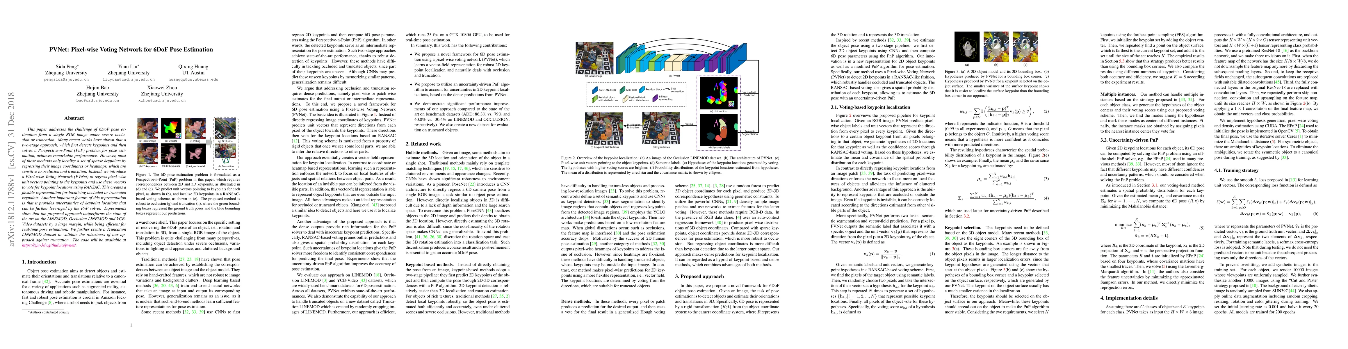 The PVNet introduces a pixel-wise voting mechanism for 6DoF pose estimation from single RGB images, leveraging pixel-wise unit vectors to localize occluded or truncated keypoints, and outperforms existing methods on various datasets. This approach is efficient and provides uncertainties in keypoint locations, enhancing real-time pose estimation.