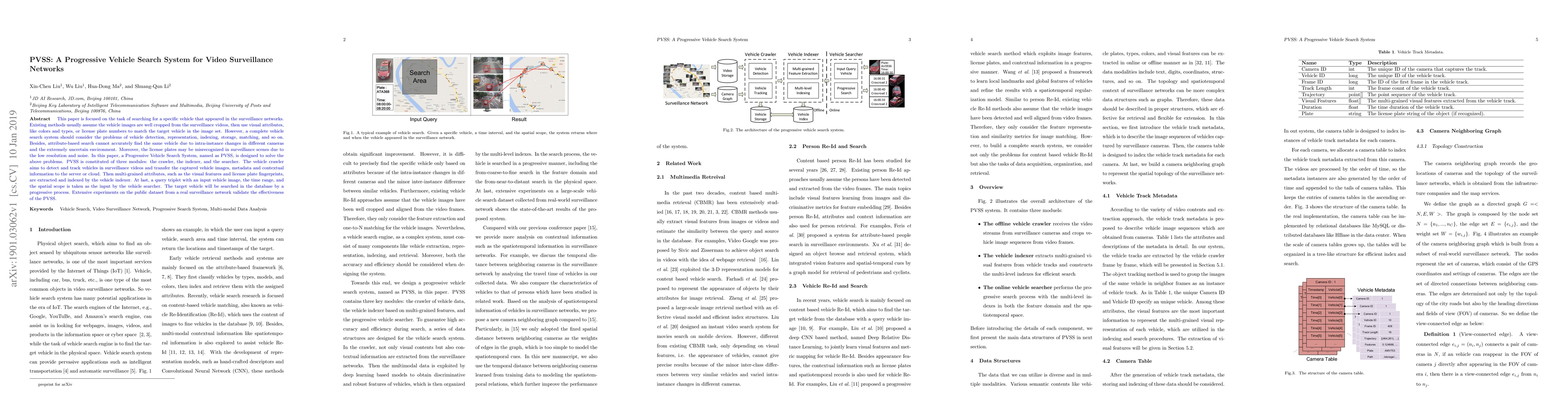 The paper introduces PVSS, a system for progressive vehicle search in surveillance networks. PVSS, consisting of crawler, indexer, and searcher modules, addresses vehicle detection, representation, indexing, and matching challenges. It uses multi-grained attributes and handles license plate misrecognition, proving effective through experiments on a real surveillance dataset.