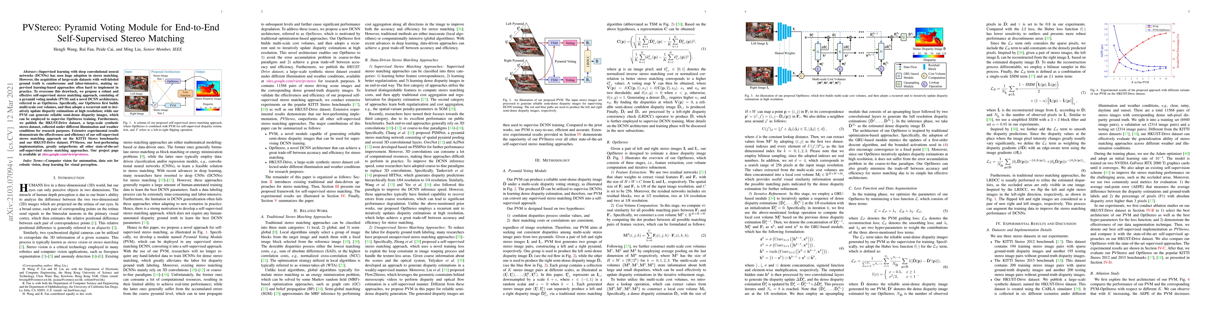 PVStereo introduces a self-supervised stereo matching approach using a pyramid voting module and a novel DCNN architecture called OptStereo, which outperforms state-of-the-art methods on KITTI and a newly published synthetic dataset, HKUST-Drive. This method eliminates the need for large-scale labeled datasets, addressing practical implementation challenges.