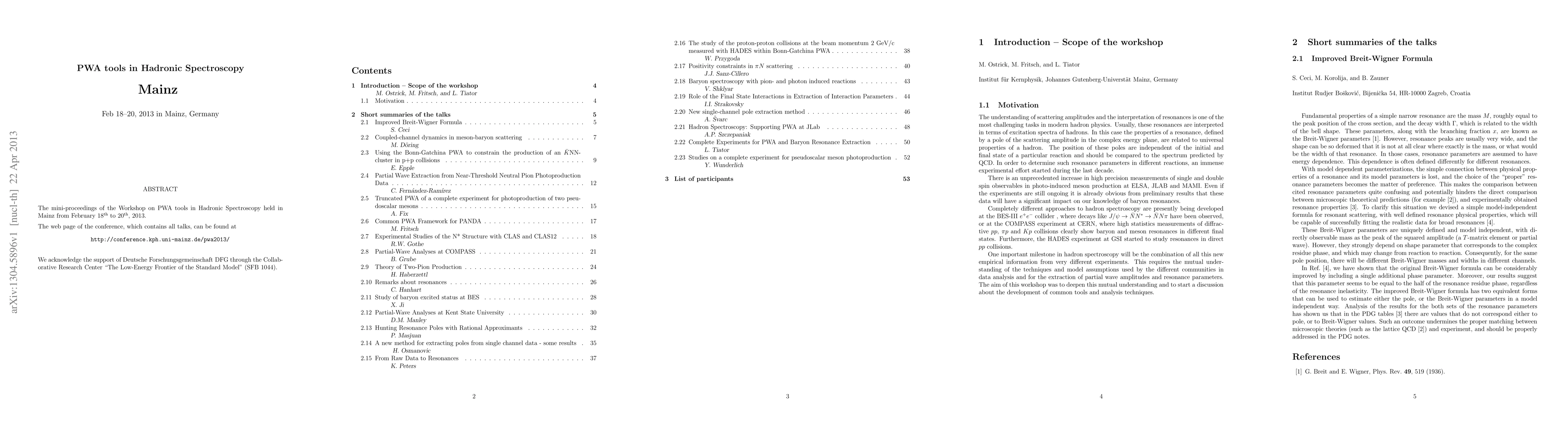 The workshop in Mainz (2013) focused on discussing tools for Partial Wave Analysis (PWA) in hadronic spectroscopy, aiming to advance understanding of particle interactions and properties, with implications for both theoretical models and experimental results in particle physics.