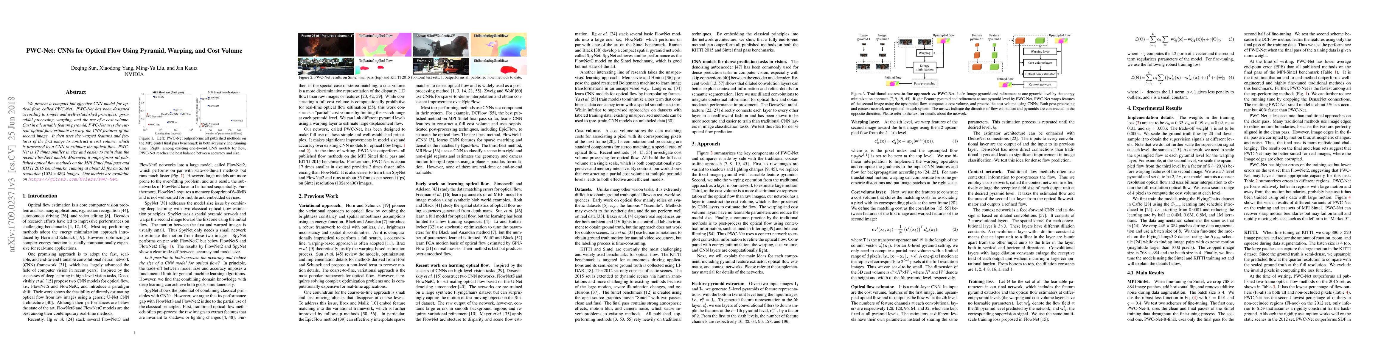 PWC-Net is a compact CNN model for optical flow that employs pyramidal processing, warping, and a cost volume. It outperforms other methods and runs efficiently at 35 fps on benchmark datasets.