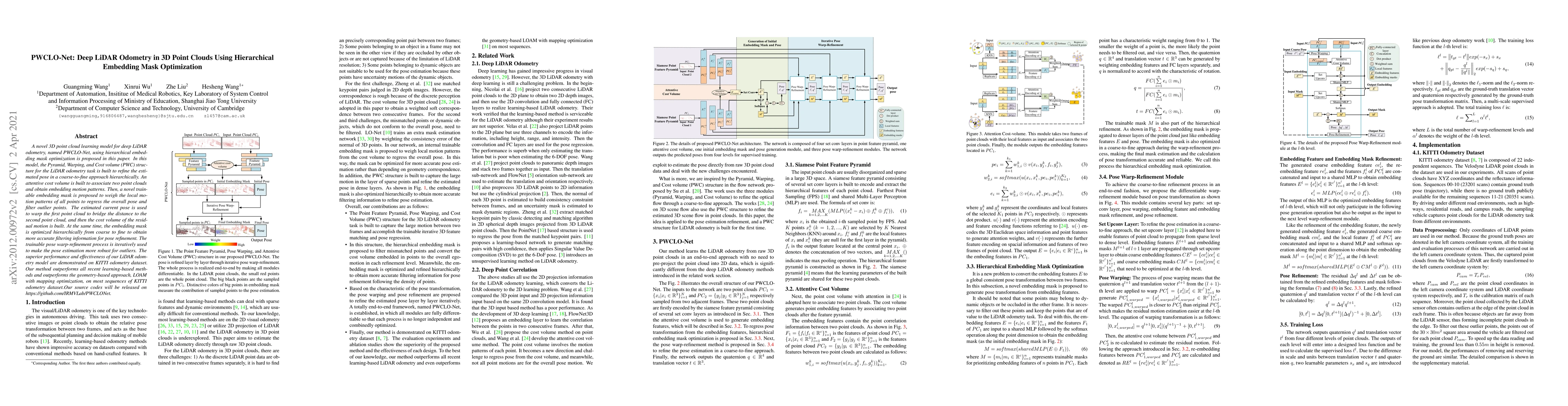 PWCLO-Net introduces a hierarchical embedding mask optimization for deep LiDAR odometry in 3D point clouds, employing a Pyramid, Warping, and Cost (PWC) structure for pose refinement. The method outperforms recent learning-based and geometry-based approaches on the KITTI odometry dataset.