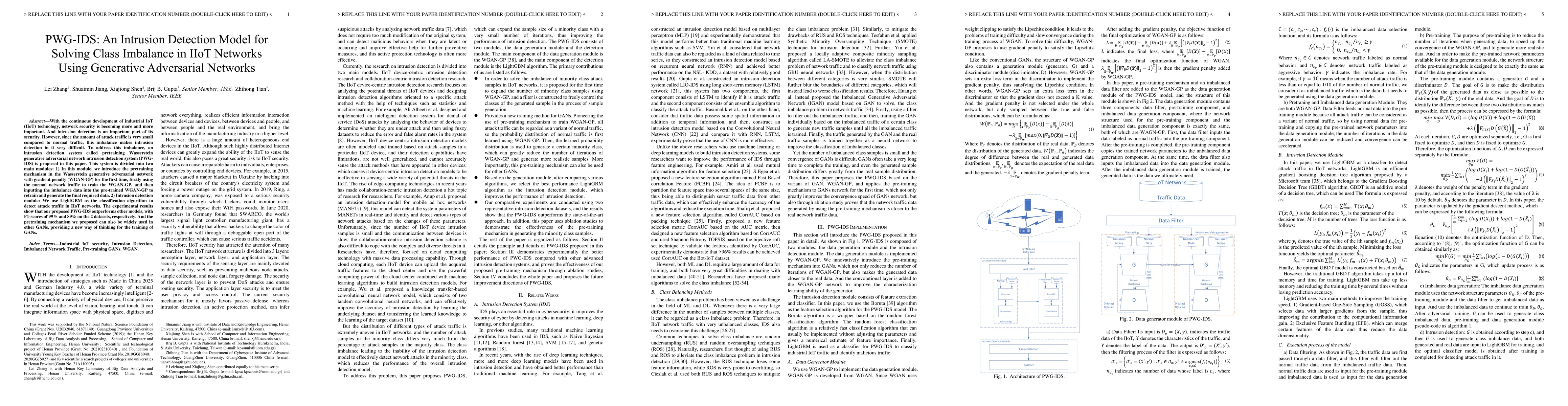 The paper proposes PWG-IDS, an intrusion detection model for IIoT networks that tackles class imbalance using a pretraining mechanism in Wasserstein GAN with gradient penalty (WGAN-GP) followed by LightGBM classification. Experimental results show superior performance with F1-scores of 99% and 89% on two datasets, highlighting the effectiveness of the pretraining approach.