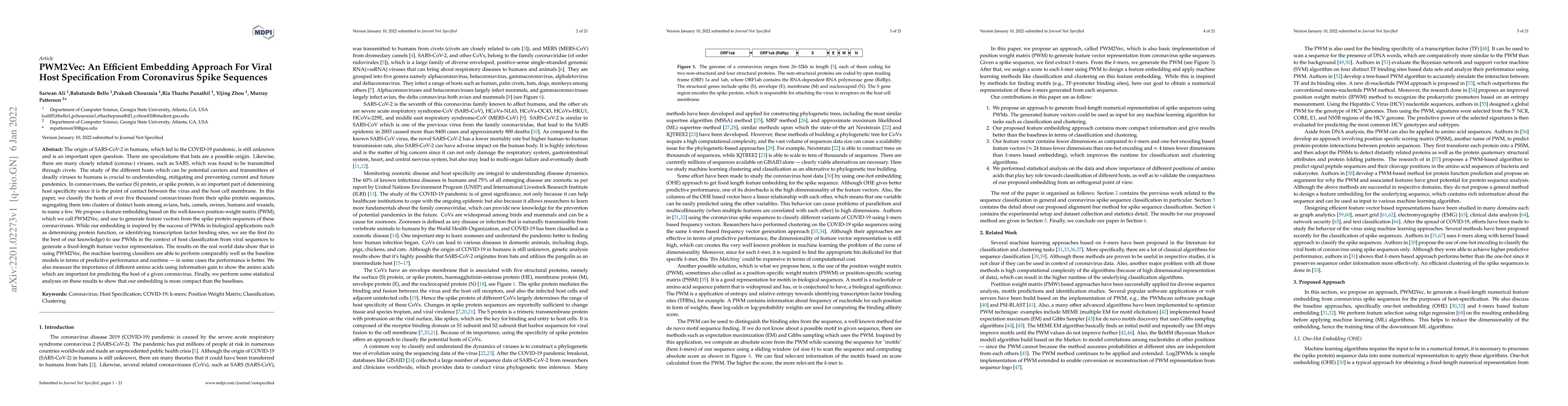 This paper proposes a novel approach called PWM2Vec to classify viral hosts from coronavirus spike protein sequences with high accuracy, outperforming baseline models.