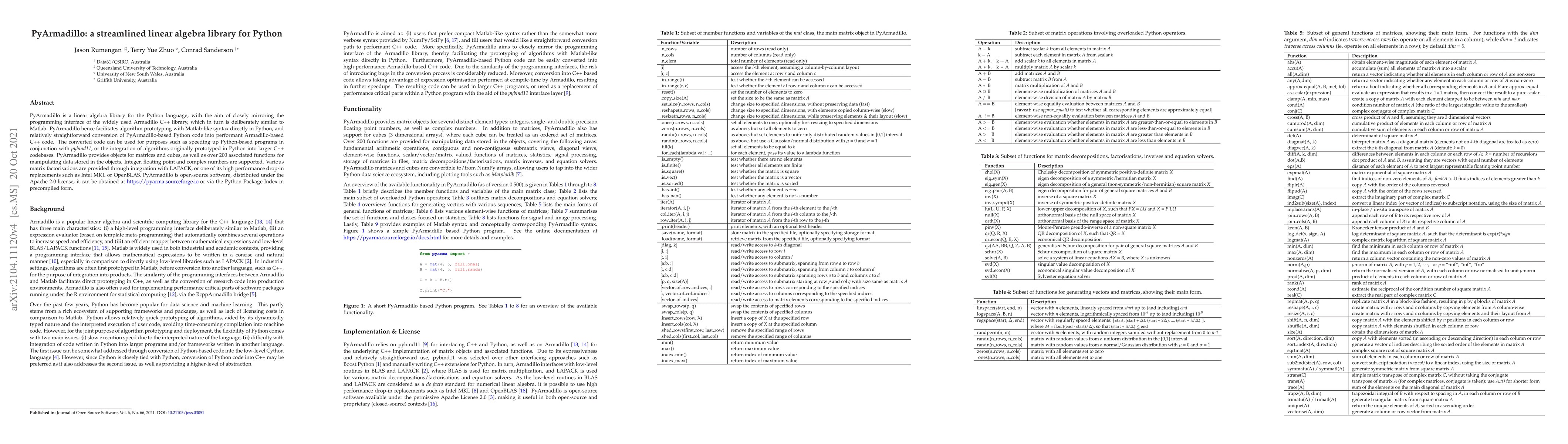 PyArmadillo is a Python linear algebra library designed to emulate the Armadillo C++ library's interface, facilitating Matlab-like syntax for algorithm prototyping and seamless conversion to performant C++ code. It offers matrix and cube objects, over 200 manipulation functions, and integration with LAPACK and high-performance alternatives.