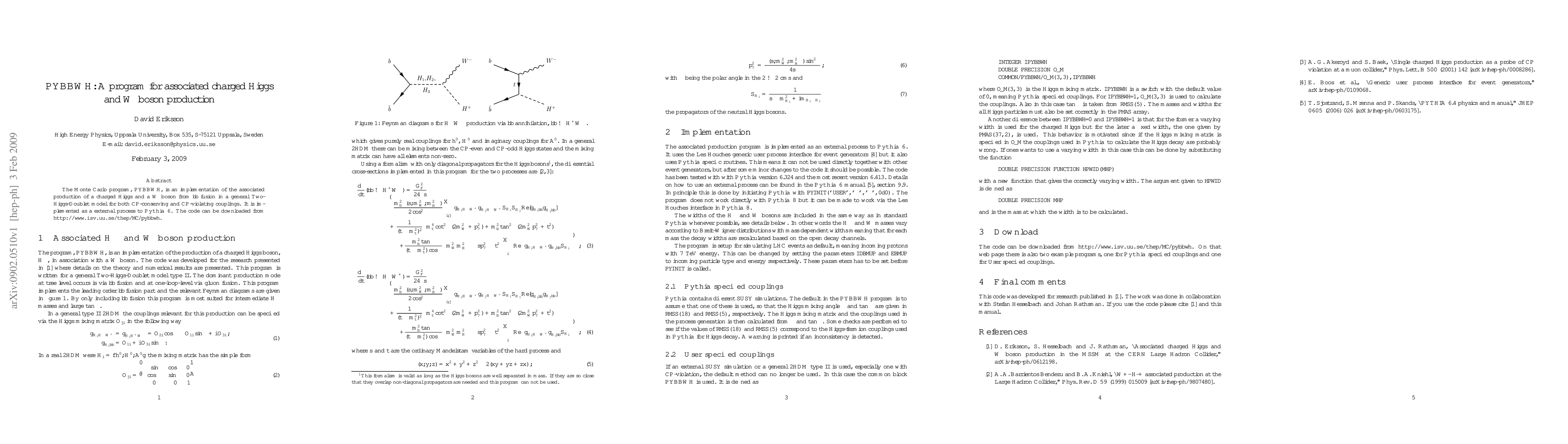 The PYBBWH program simulates the production of a charged Higgs and a W boson via bb fusion in a general Two-Higgs-Doublet model, supporting both CP-conserving and CP-violating scenarios, and is integrated as an external process with Pythia 6. Available for download at http://www.isv.uu.se/thep/MC/pybbwh/.