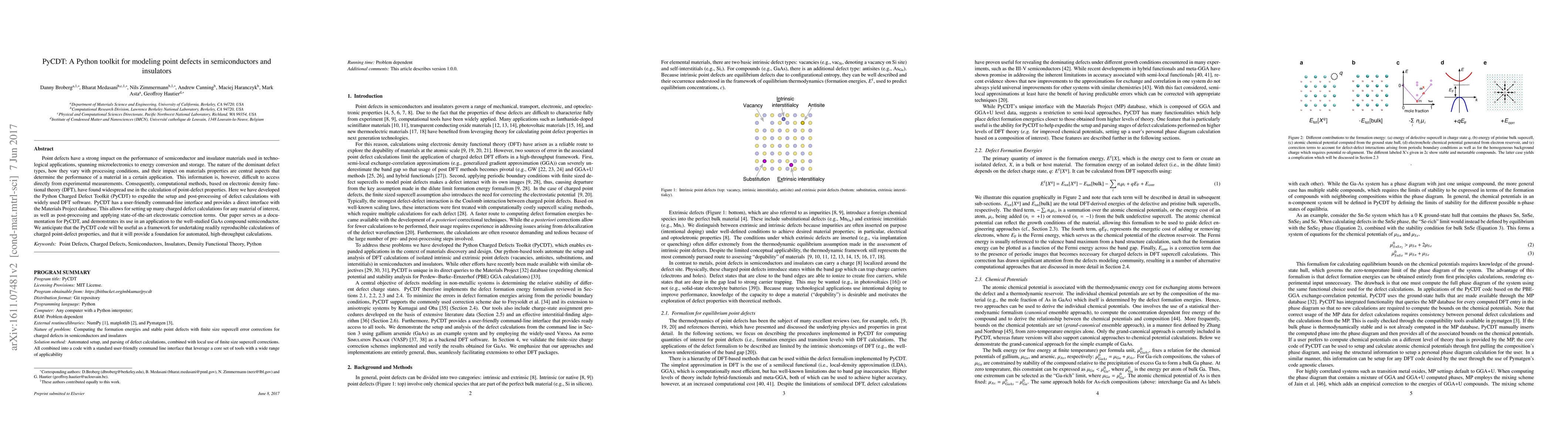 PyCDT is a Python toolkit designed to simplify the modeling of point defects in semiconductors using computational methods based on DFT. It offers a user-friendly interface and integrates with the Materials Project database, facilitating high-throughput calculations and reproducible defect analysis.